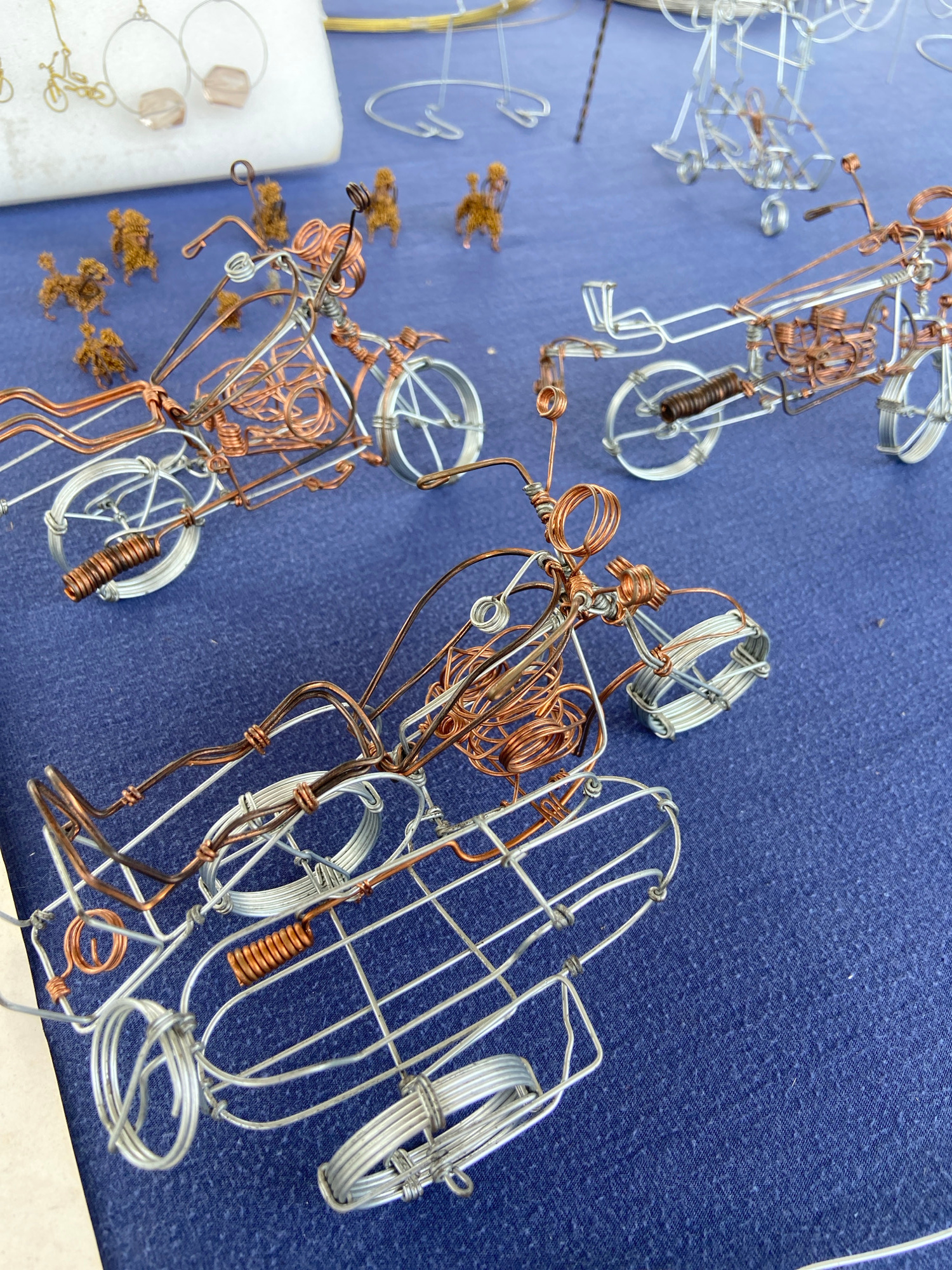 The image shows three wire-frame vehicles on a blue fabric surface. The vehicles are primarily constructed of copper and silver-colored wire. Two of the vehicles appear to be motorcycles, while the th…read more