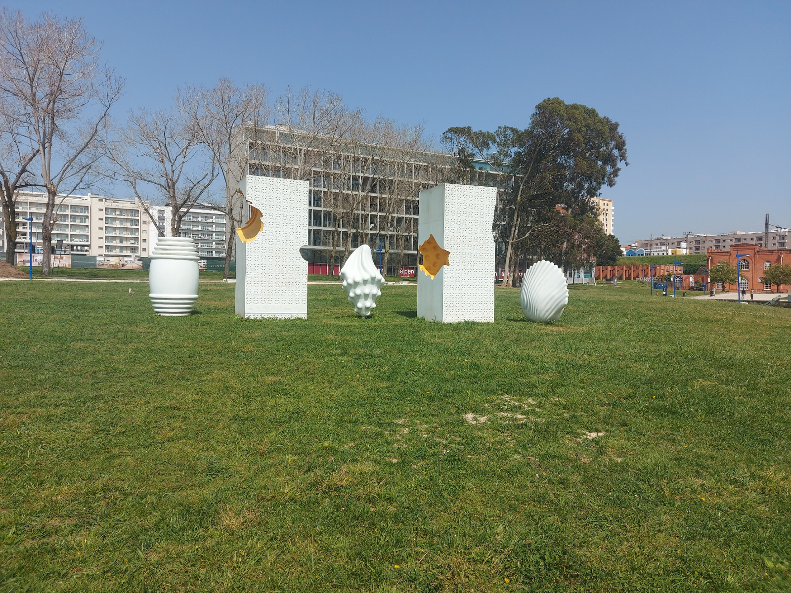 The image shows a grassy park in Aveiro, Portugal, featuring several large white art installations. These include two textured rectangular columns with internal golden shapes, a stack of white rings,…read more