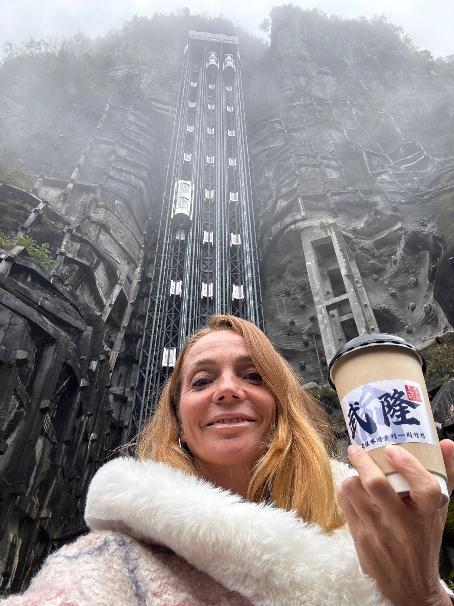 A person, with blonde hair, is holding a beverage container with an Asian language inscription, in front of the Bailong Elevator in Wulong District, China. The elevator is a tall metal structure built…read more