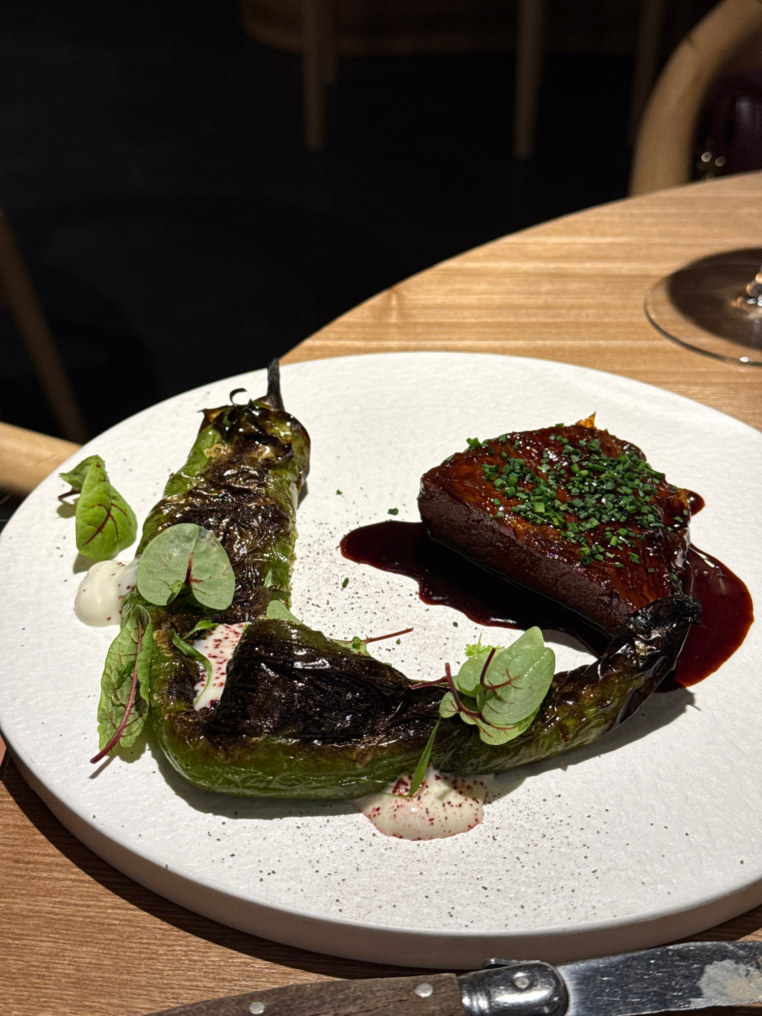 A culinary presentation is captured from an overhead angle on a white plate. The plate contains a dark-brown, rectangular piece of meat covered in a dark sauce and sprinkled with finely chopped green…read more