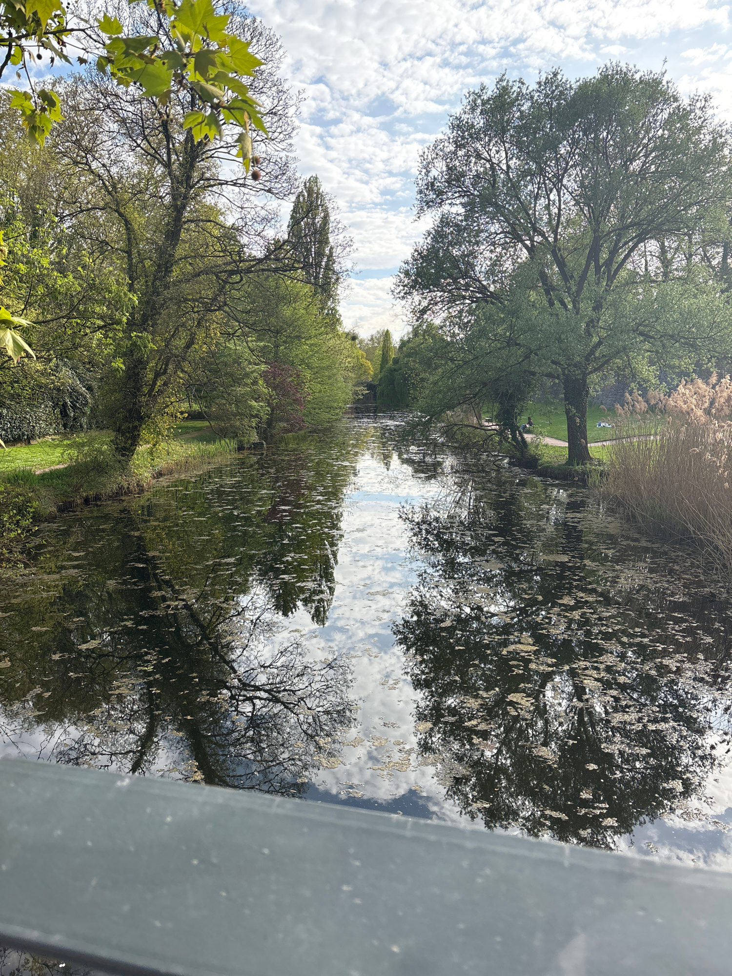 The image captures a serene outdoor scene, likely a park or canal bank in Strasbourg, France, characterized by lush greenery and calm water. The perspective is oriented to show the sky, trees, and the…read more