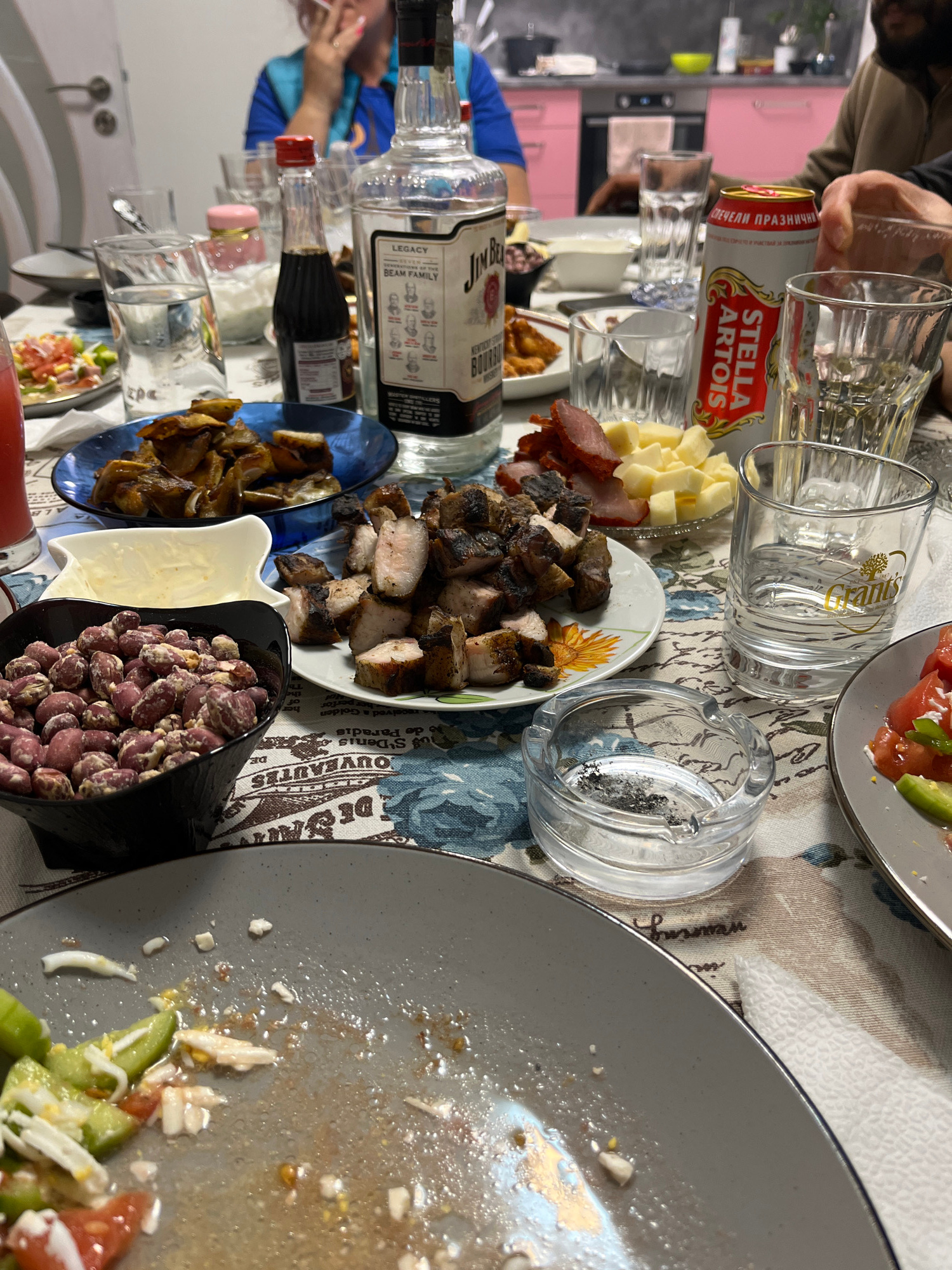 This image depicts a table laden with food and beverages, possibly in Karavelovo, Bulgaria, though that cannot be definitively confirmed from the scene. The scene is oriented with an oblique, overhead perspective. Several bottles of alcohol are visible, including Jim Beam bourbon and Stella Artois beer. There are multiple glasses, some full, some empty, scattered across the table. Plates of food include what appear to be grilled pork, beans, salad, cheese cubes, and sliced meat. An ashtray is also present. There are people around the table; at least two individuals can be partially seen. One person is holding a can of Stella Artois. The other appears to be in a blue shirt. The table is covered with a patterned cloth. The setting suggests a social gathering, perhaps a meal or party. | Open Wire