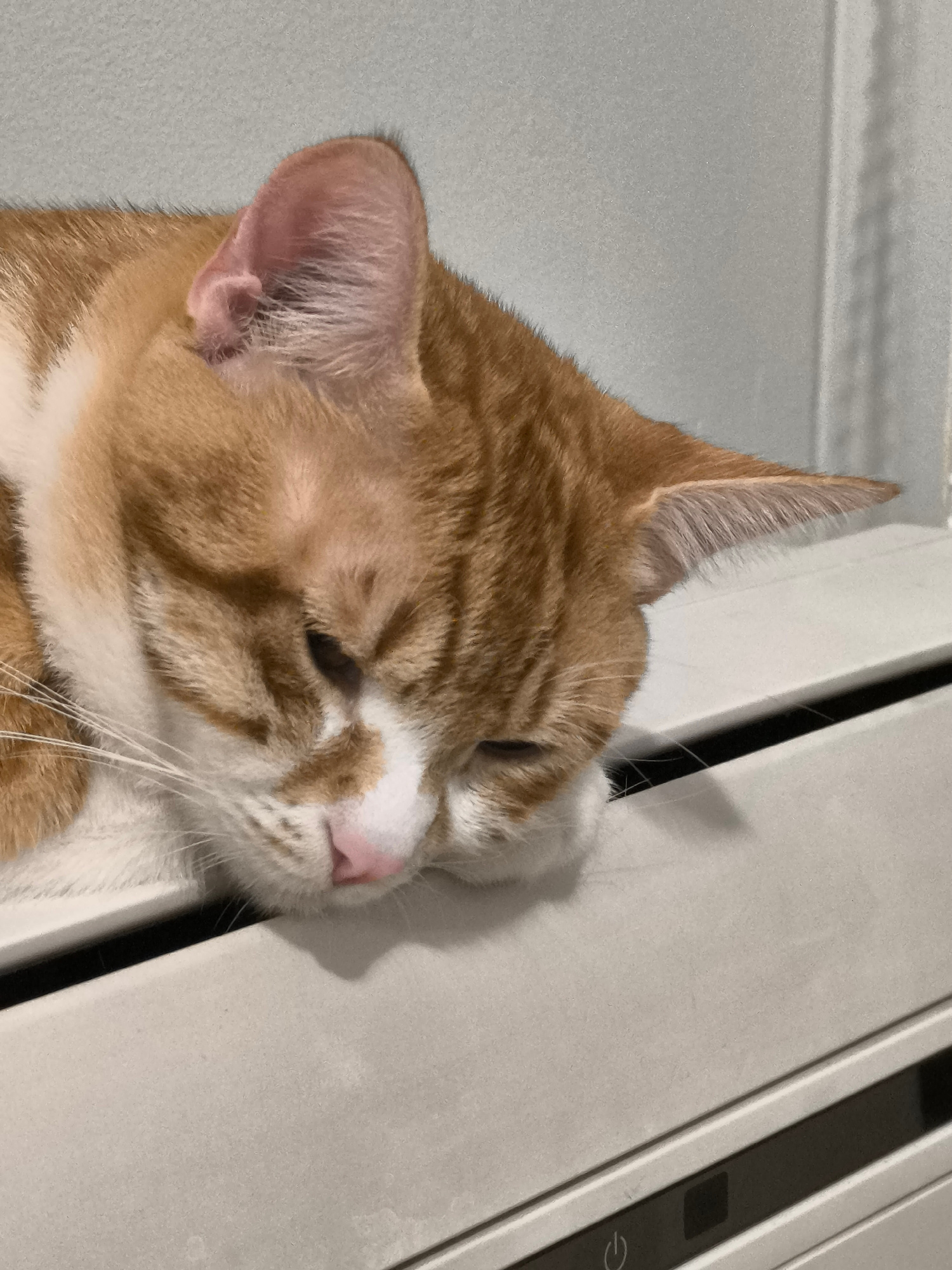 An orange tabby cat is resting on top of a white appliance. The cat's head is resting on its paws. The appliance has a power button on the bottom right. The background is a light grey wall with vertic…read more