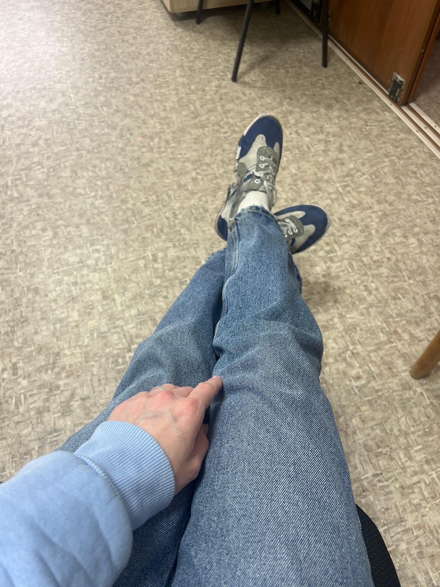 A view from above shows a person sitting in a chair, wearing blue jeans, a light blue sweater, and blue and gray sneakers. The person's right hand is resting on their right leg. The floor is a light g…read more