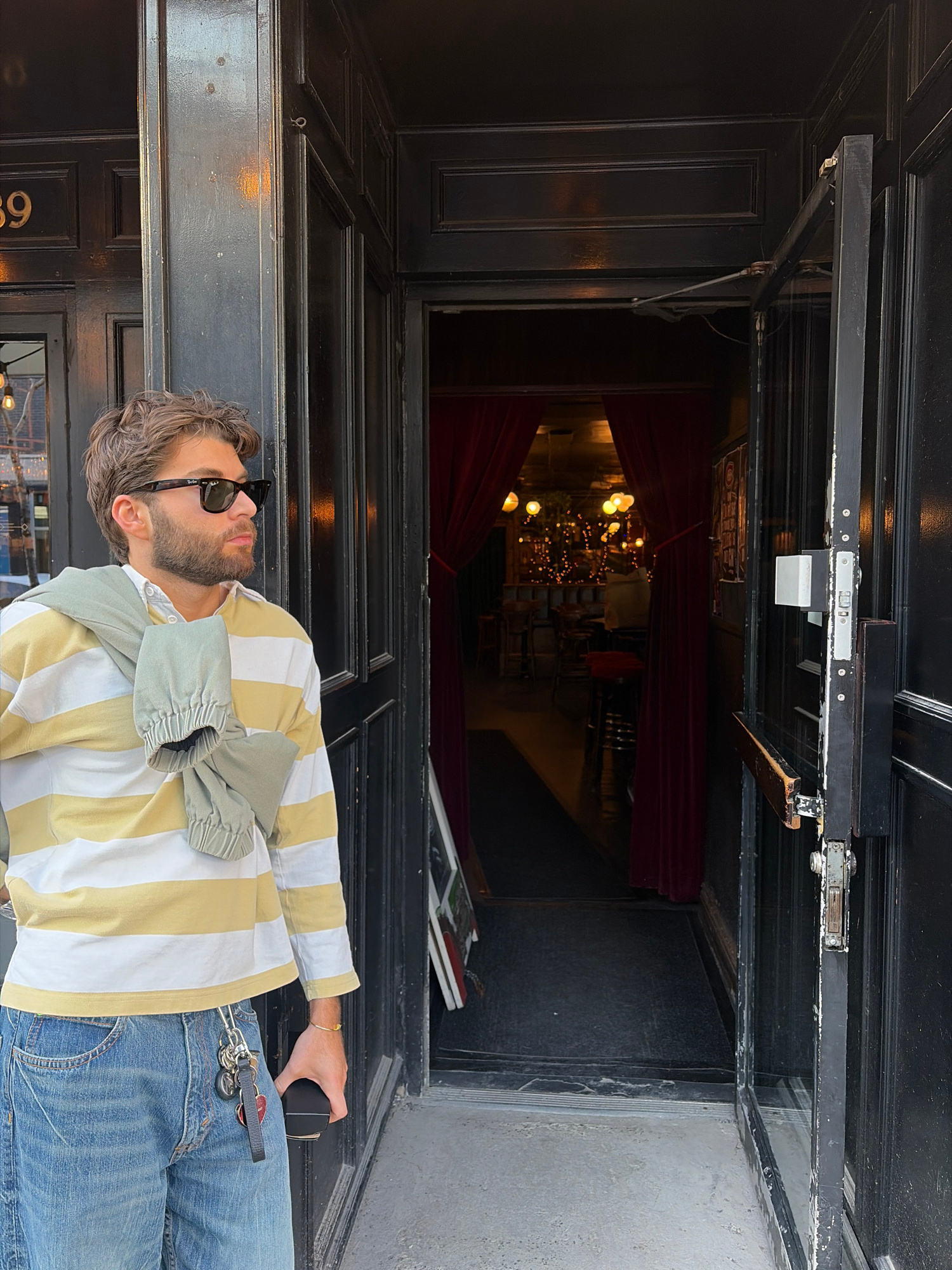 A man with brown hair and a beard, wearing sunglasses, a yellow and white striped shirt, and blue jeans, stands in the entrance of a building. He is holding a black wallet and keys. The entrance is fr…read more