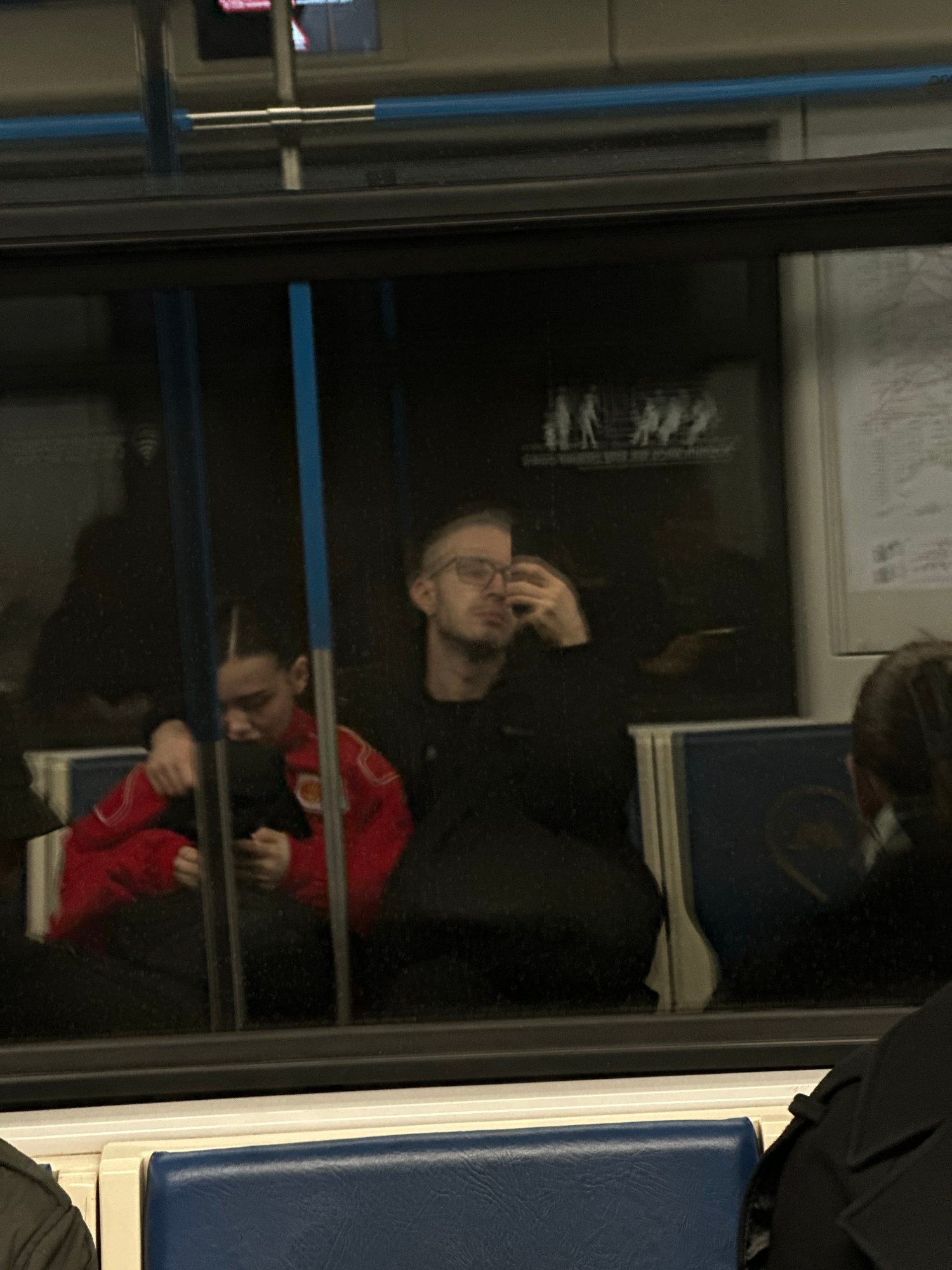 The image depicts the reflection of a man with glasses on a train in Moscow, Russia. The man is wearing a black shirt and a red jacket with white cuffs. He is looking at his reflection and adjusting h…read more