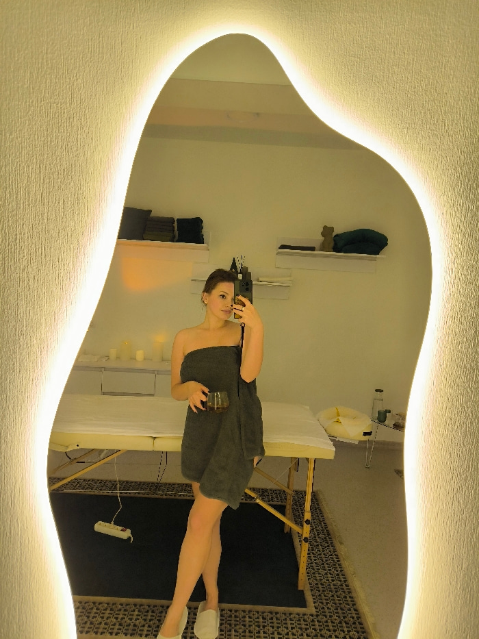 A young adult female is captured in a full-length mirror selfie within a spa or massage therapy room in Vinnytsia, Ukraine. She stands facing the mirror, holding a dark-colored glass in her left hand…read more