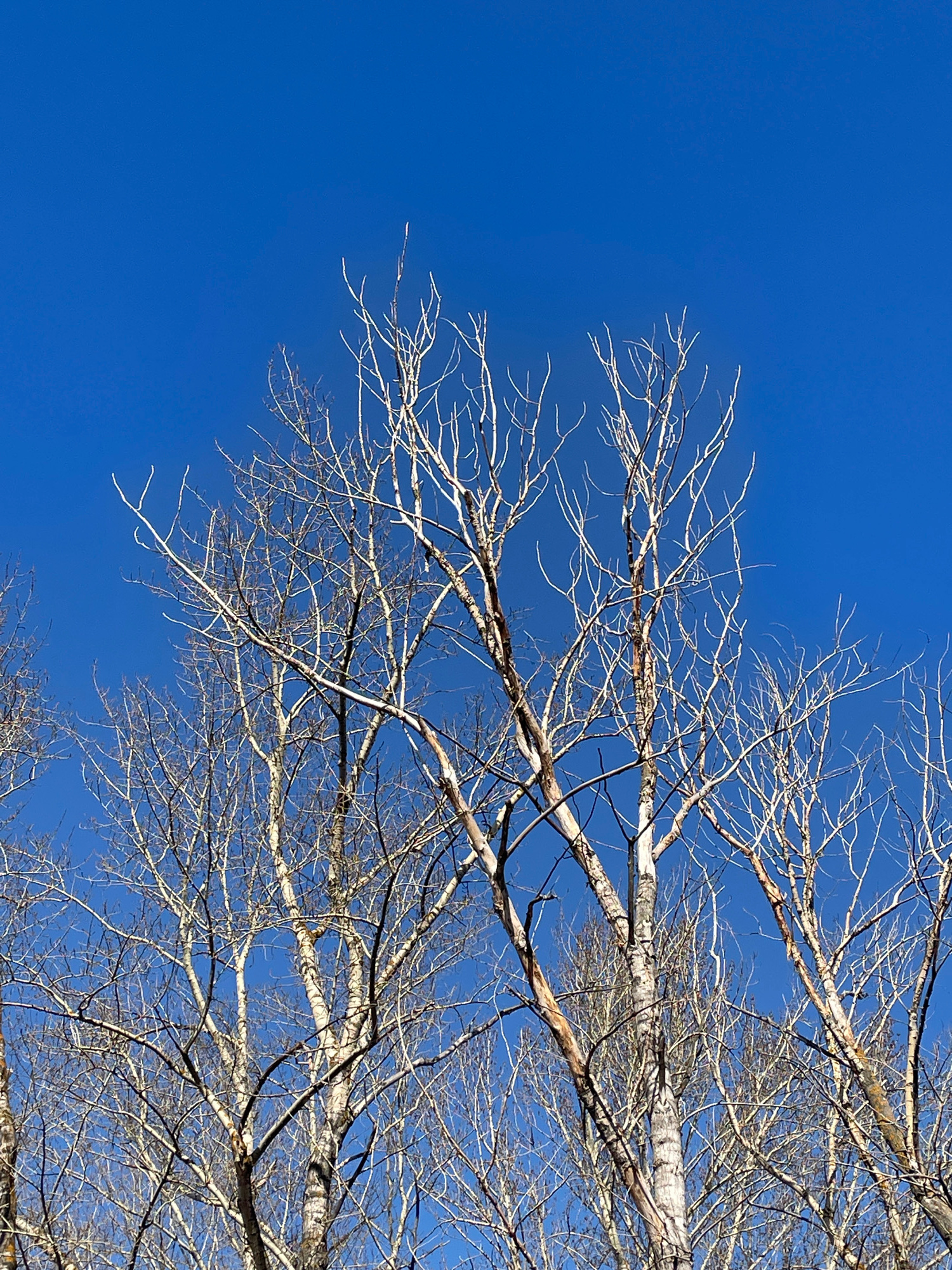 The image shows tree branches against a clear, bright blue sky. The branches are bare, suggesting it is either late fall or winter. The tree trunk is light-colored with horizontal patterns, possibly b…read more