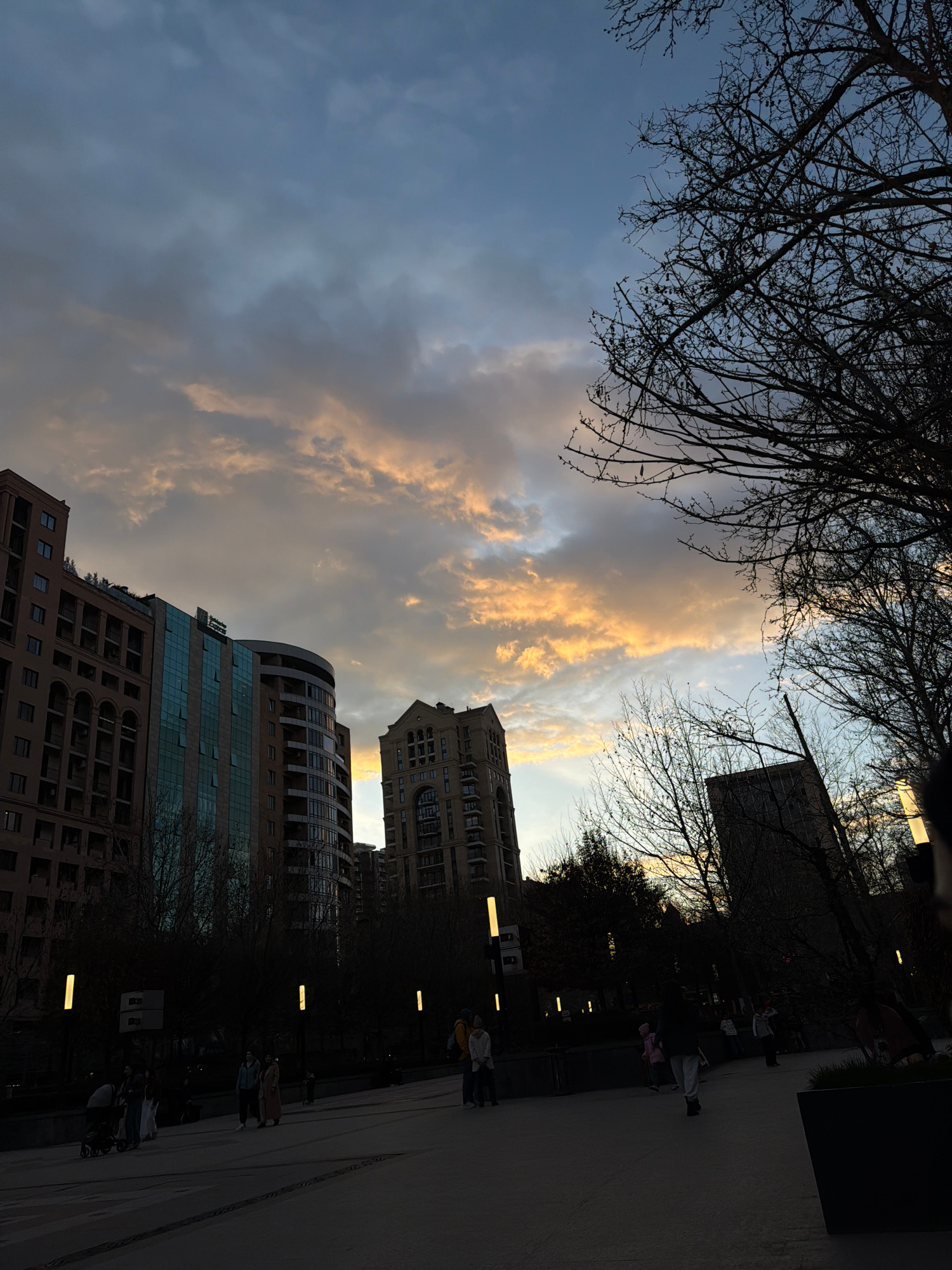 The image shows a street in Yerevan, Armenia, at dusk. Tall, modern buildings line one side of the street, partially obscured by bare trees. The sky is filled with clouds, some tinged with orange from…read more