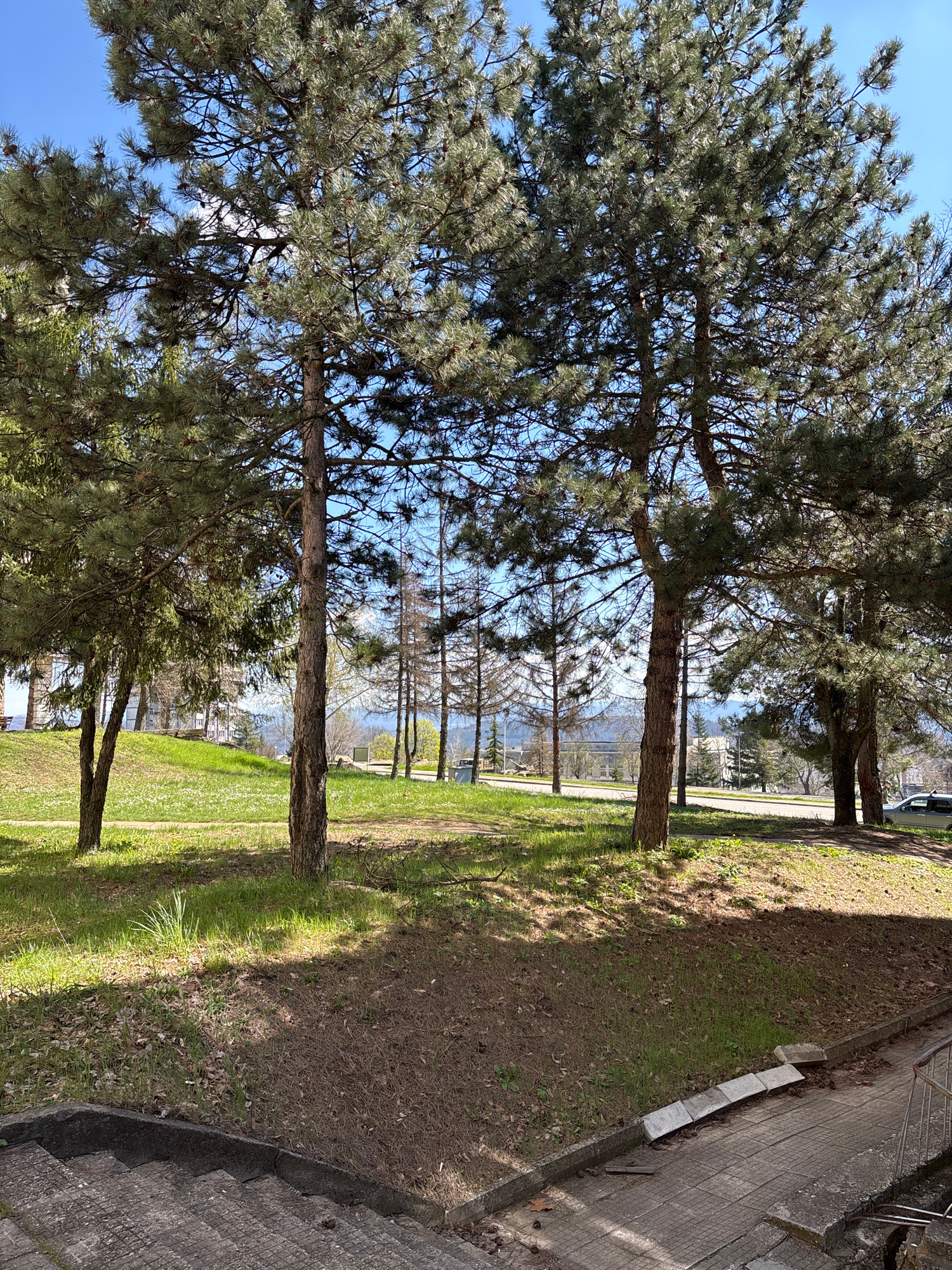 The image presents a view in Ledenik, Bulgaria, dominated by several pine trees lining an edge bordering a street. The trees' canopies fill the upper left quadrant of the frame, contrasting with patch…read more