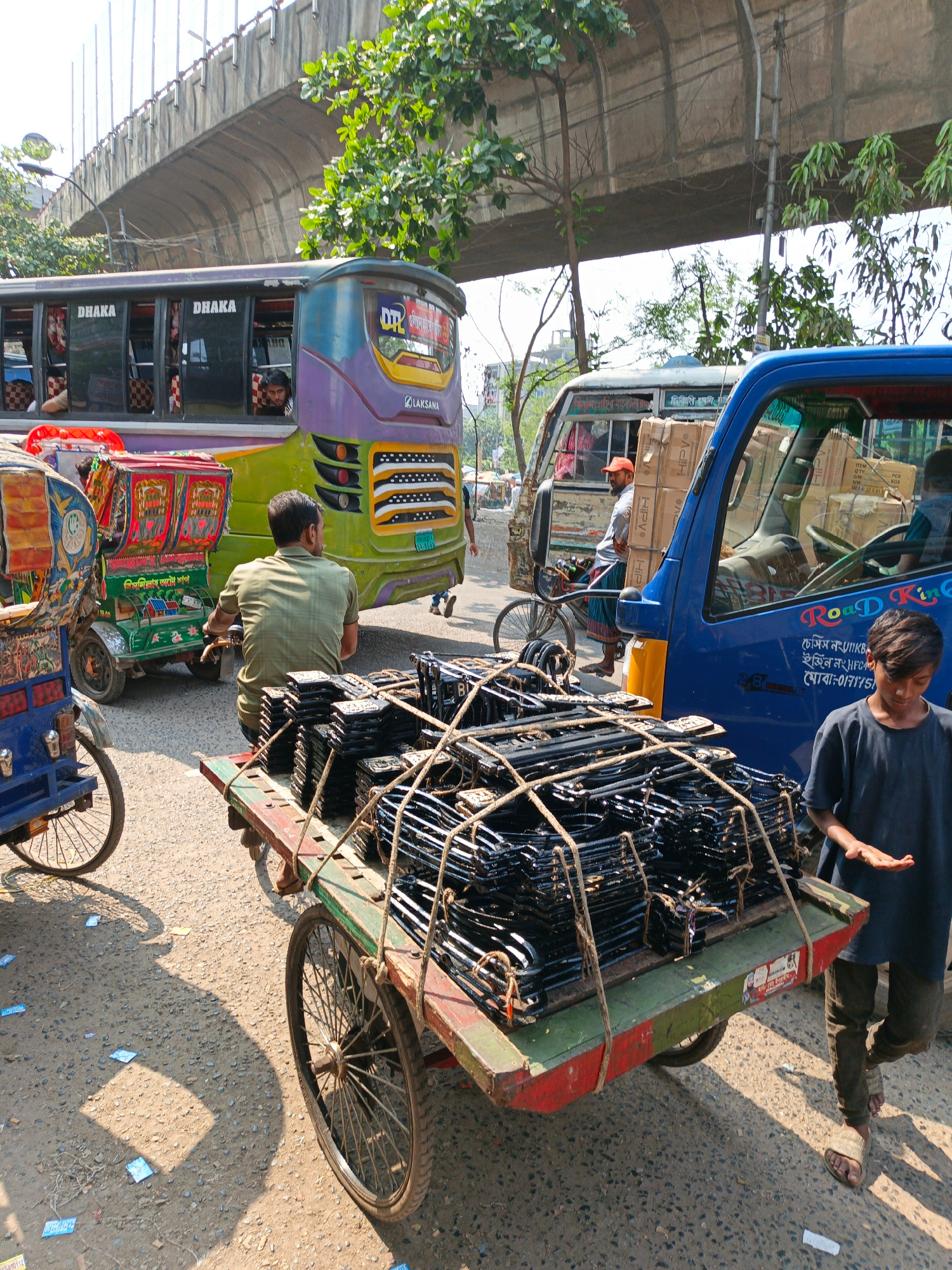 The image captures a bustling street scene in Dhaka, Bangladesh, characterized by a mix of public transportation, informal commerce, and pedestrian activity. In the foreground, a three-wheeled cart, h…read more