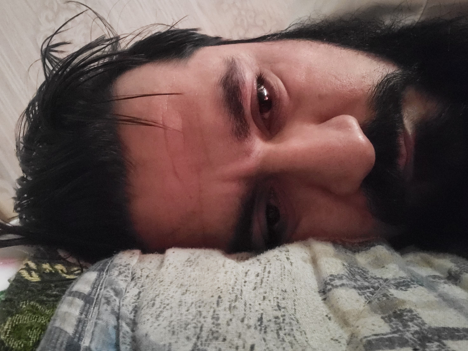 A close-up, angled shot shows a person's face resting on a patterned pillow or blanket. The person has dark hair, a beard, and is looking slightly upwards. Their eye appears bloodshot. There is no disβ¦read more