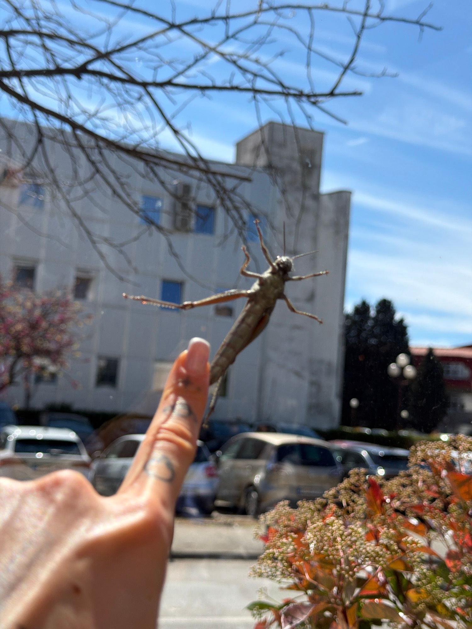 The image shows a praying mantis clinging to a window, viewed from the inside. A hand is visible, with a tattooed finger pointed towards the mantis. The background, seen through the window, includes a…read more