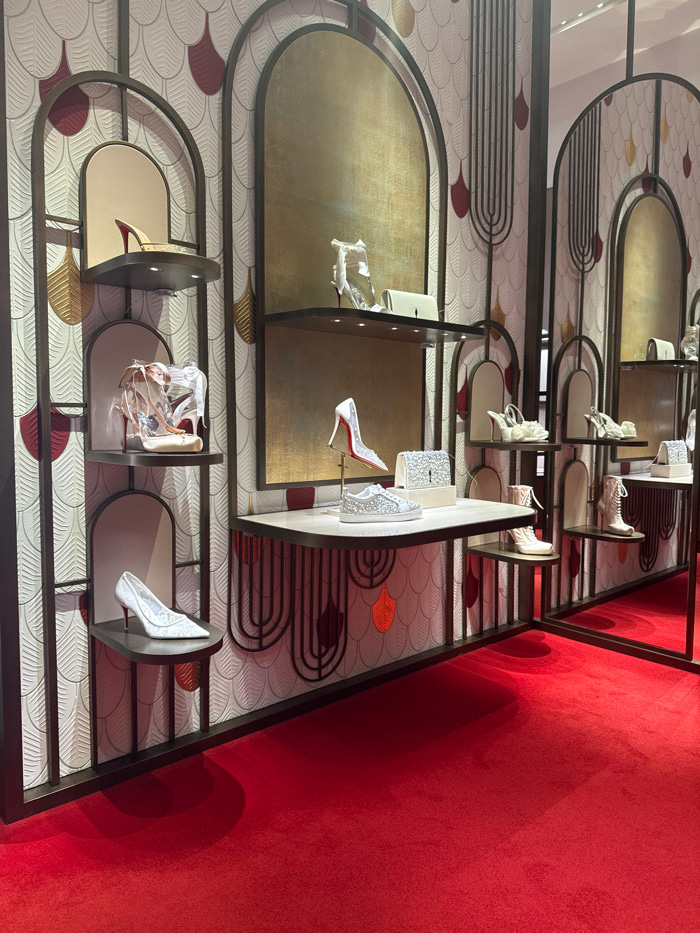 This is an interior view of a retail display, identified as a Christian Louboutin boutique located in Winchester, United States of America. The environment features a bright red carpeted floor and wal…read more