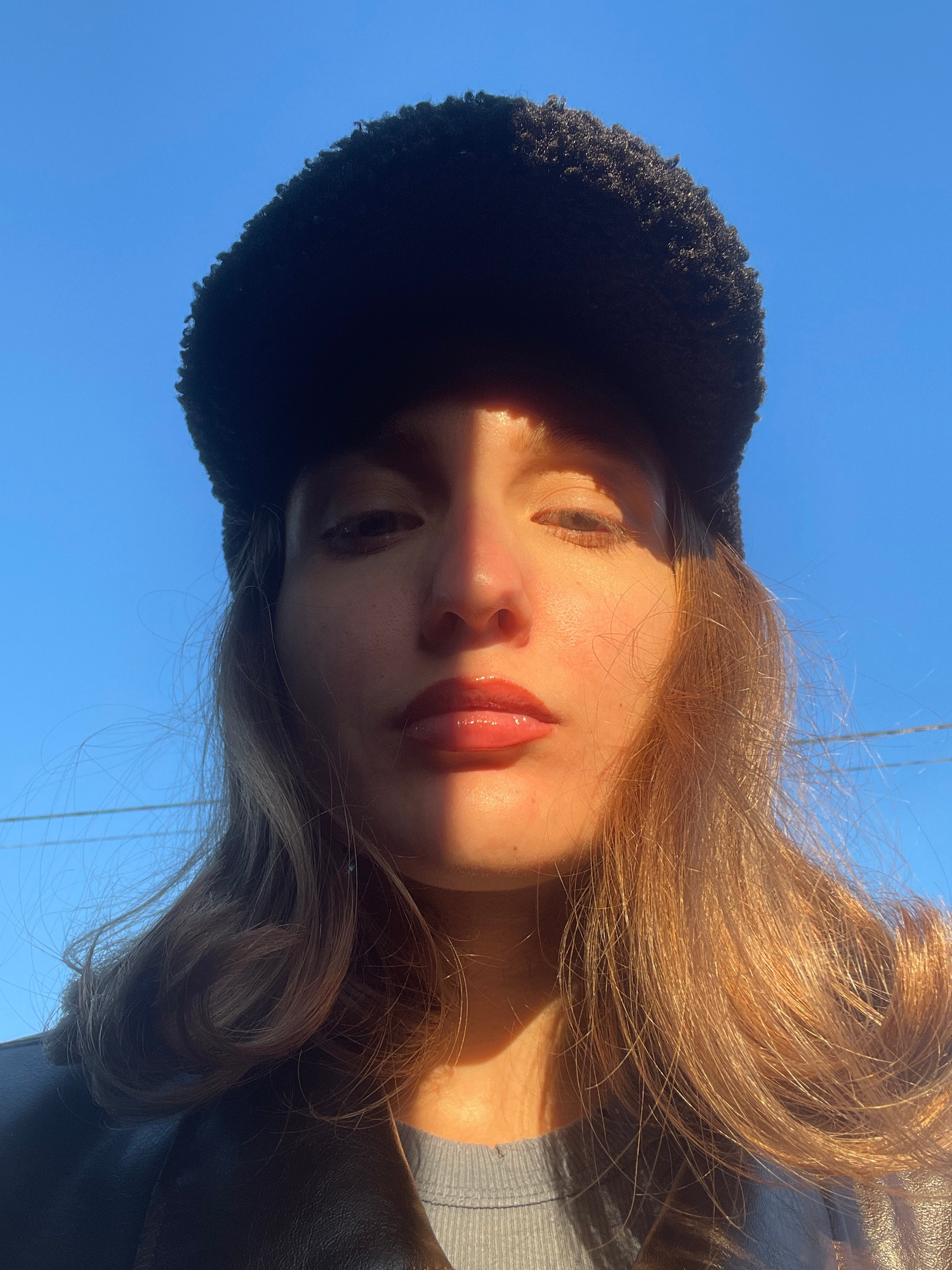 A vibrant, sunlit close-up features a young woman with her head tilted to the right, looking upwards towards a clear blue sky. She is wearing a dark, possibly fuzzy or textured, hat on the left side o…read more