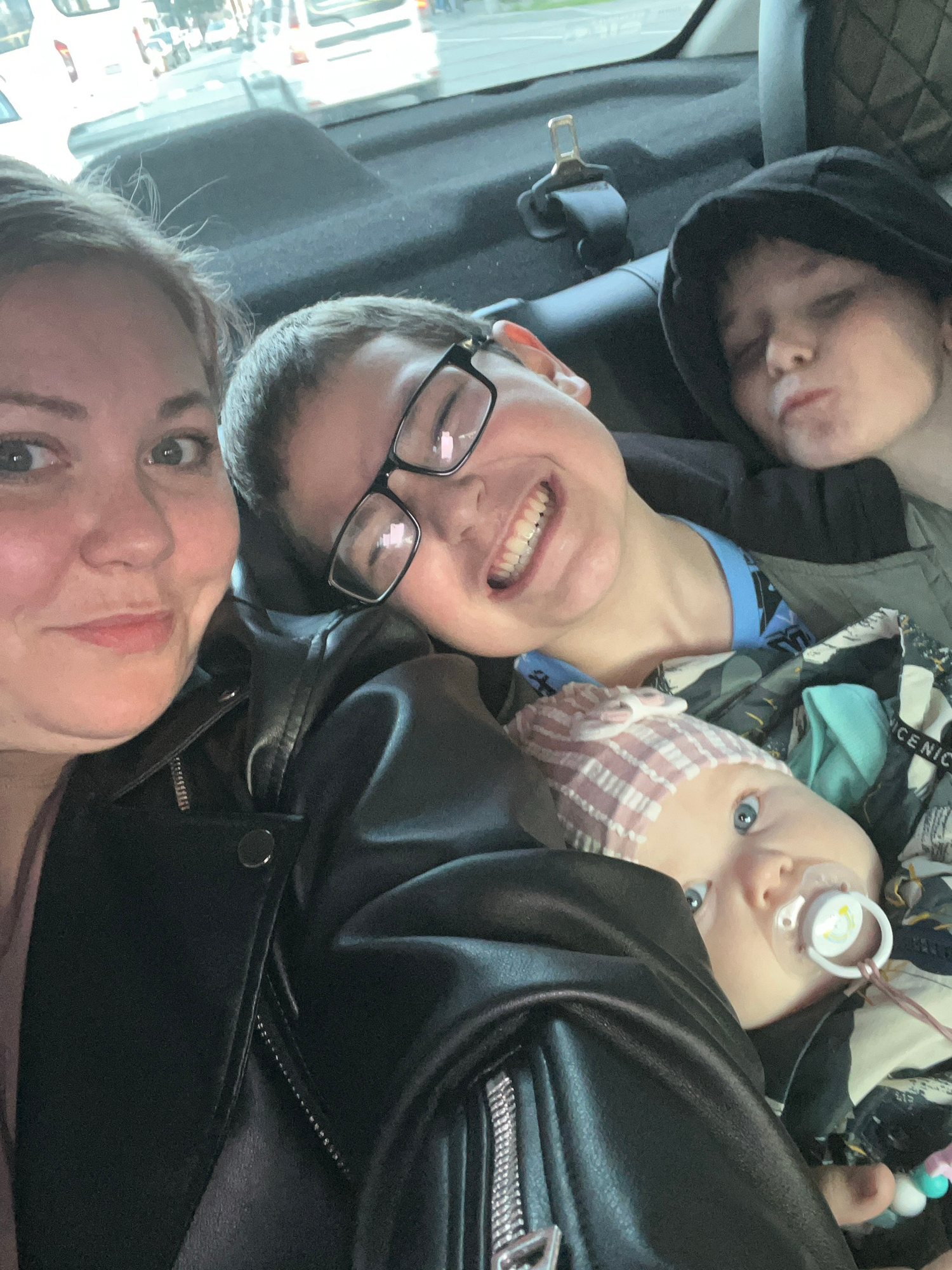 The image captures a selfie taken inside a vehicle. The location appears to be outside, possibly in Sirius, Russia, based on visual cues from the window. A group of four individuals are visible in the…read more
