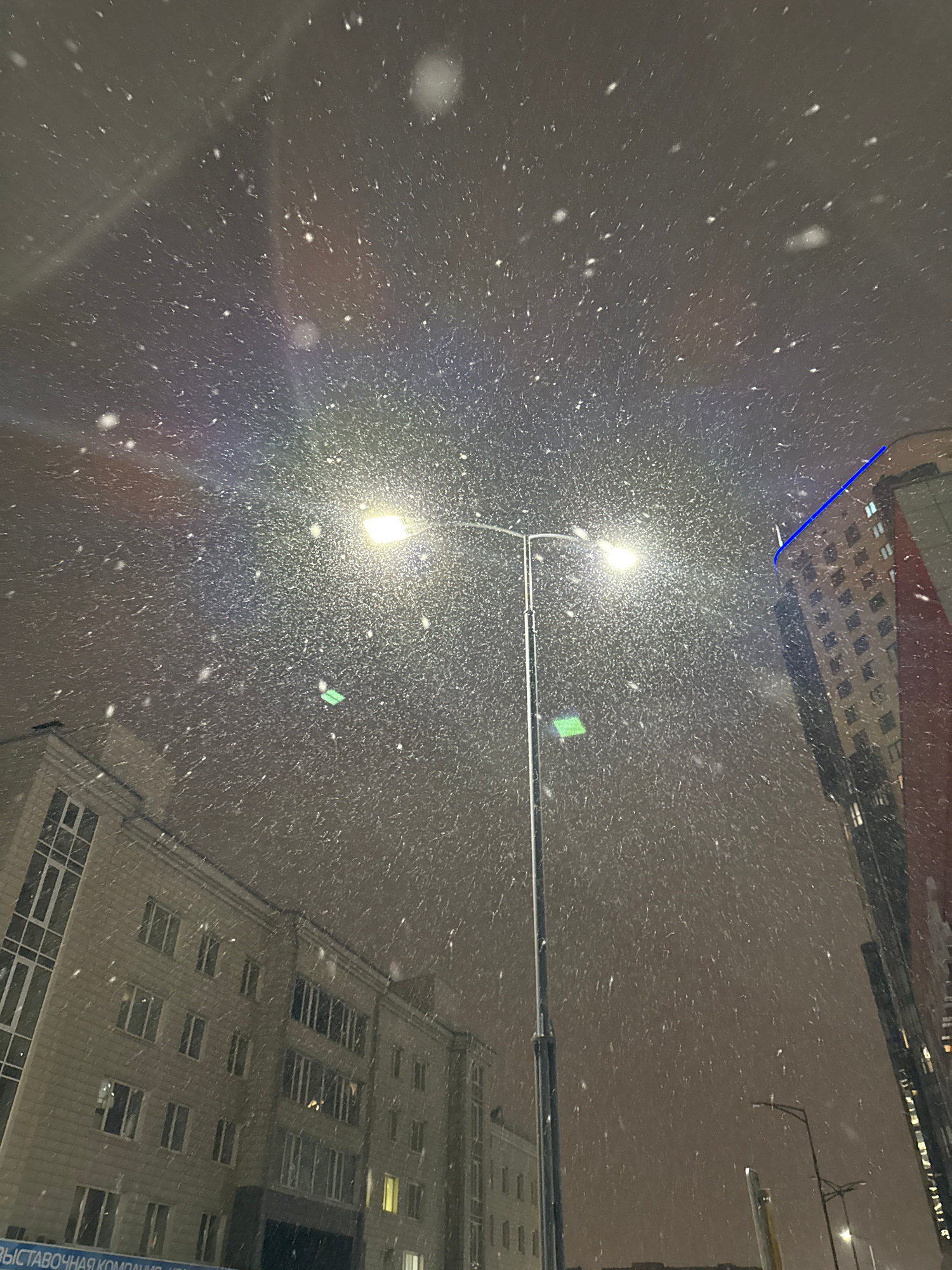 The image, shot from a low angle, depicts a heavy snowfall at night in an urban area. Two tall buildings frame the scene on the upper left and lower right sides, their illuminated windows visible thro…read more