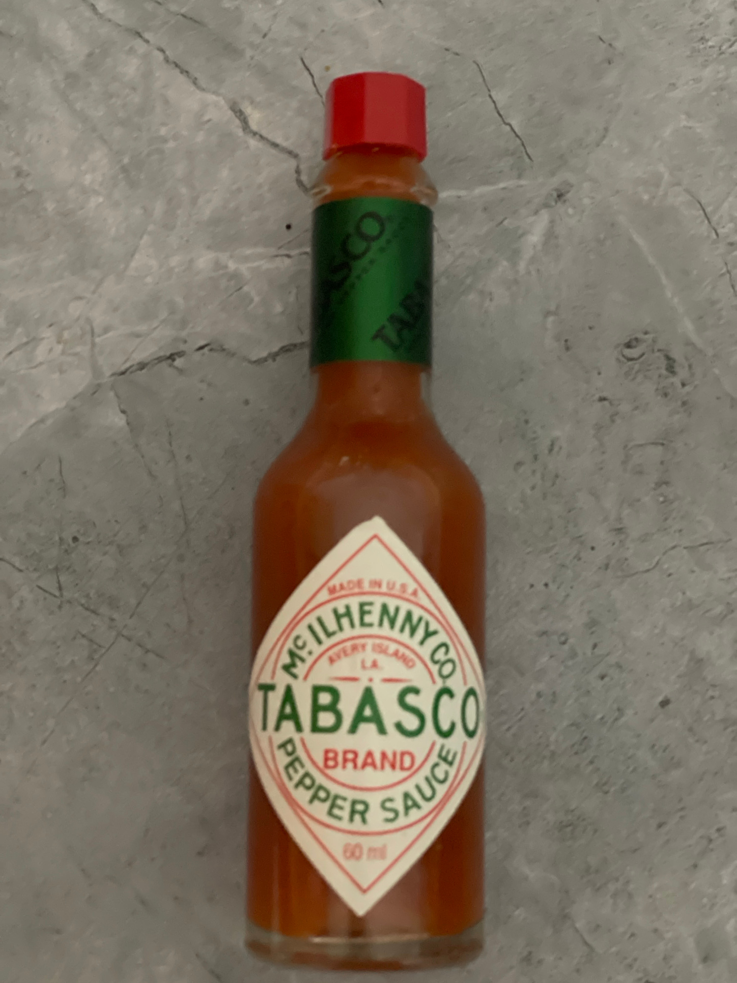 A bottle of Tabasco hot sauce is laying horizontally on a textured, neutral gray surface, possibly marble. The bottle has a red cap and a green label around the neck with the word "TABASCO" printed on…read more
