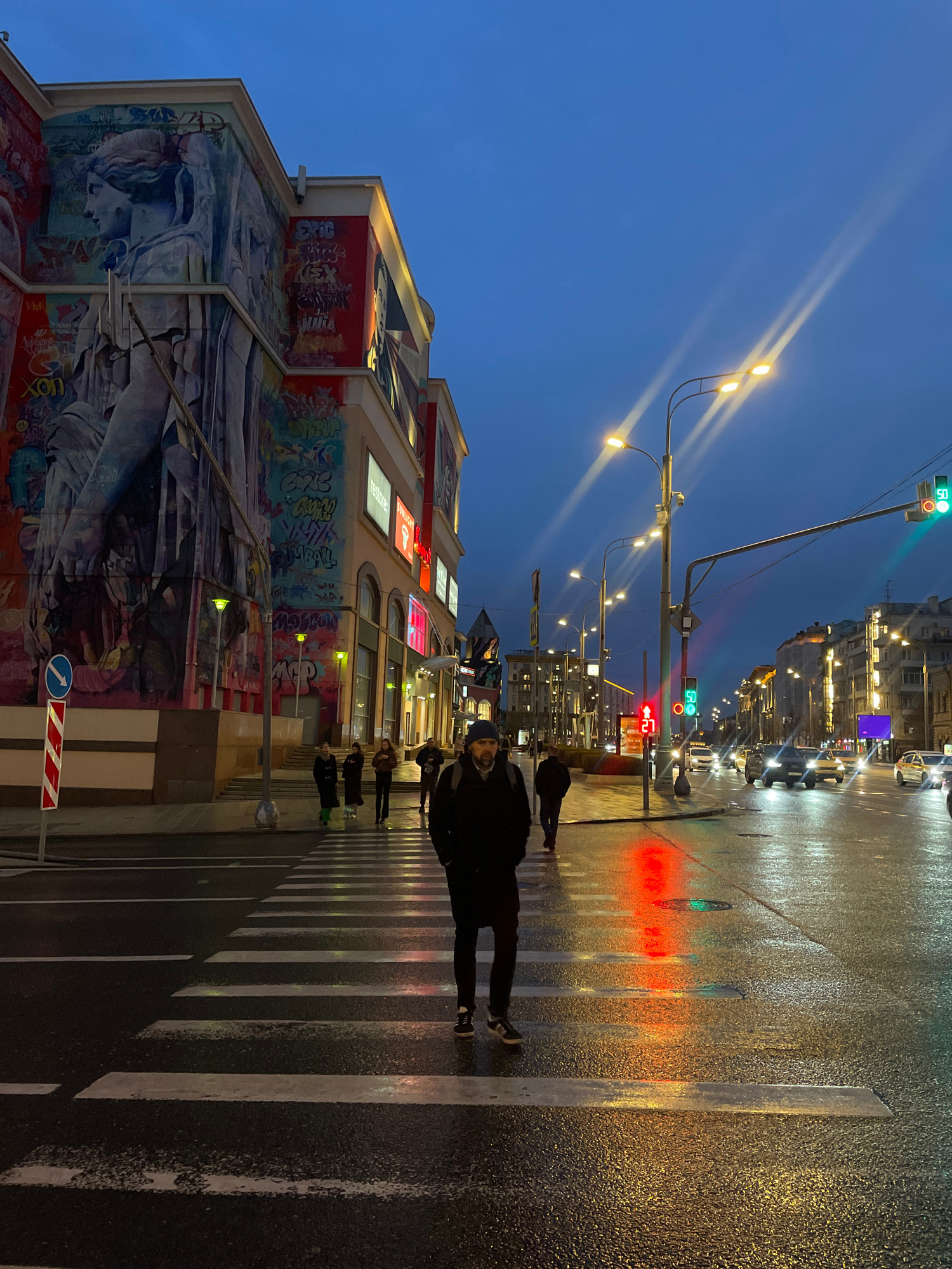 The image depicts a street scene in Moscow, Russia at dusk. The photograph is taken at street level at a crosswalk. The road surface is wet and reflects the city lights. A building with colorful graffβ¦read more