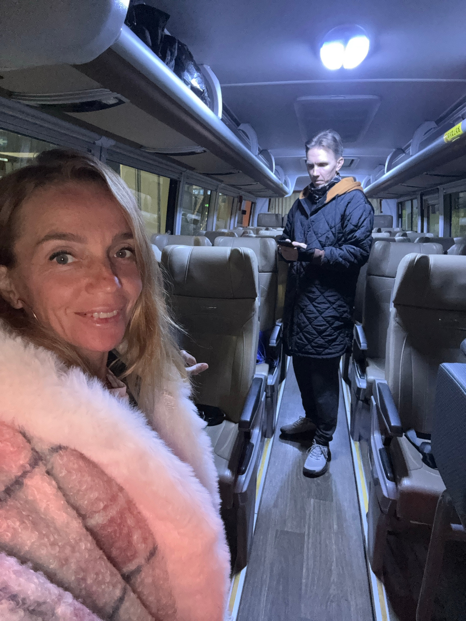 The image appears to be taken inside a bus or train carriage, illuminated by overhead lighting. A woman is taking a selfie in the foreground, partially obscured by a pink and white furry coat. In theβ¦read more
