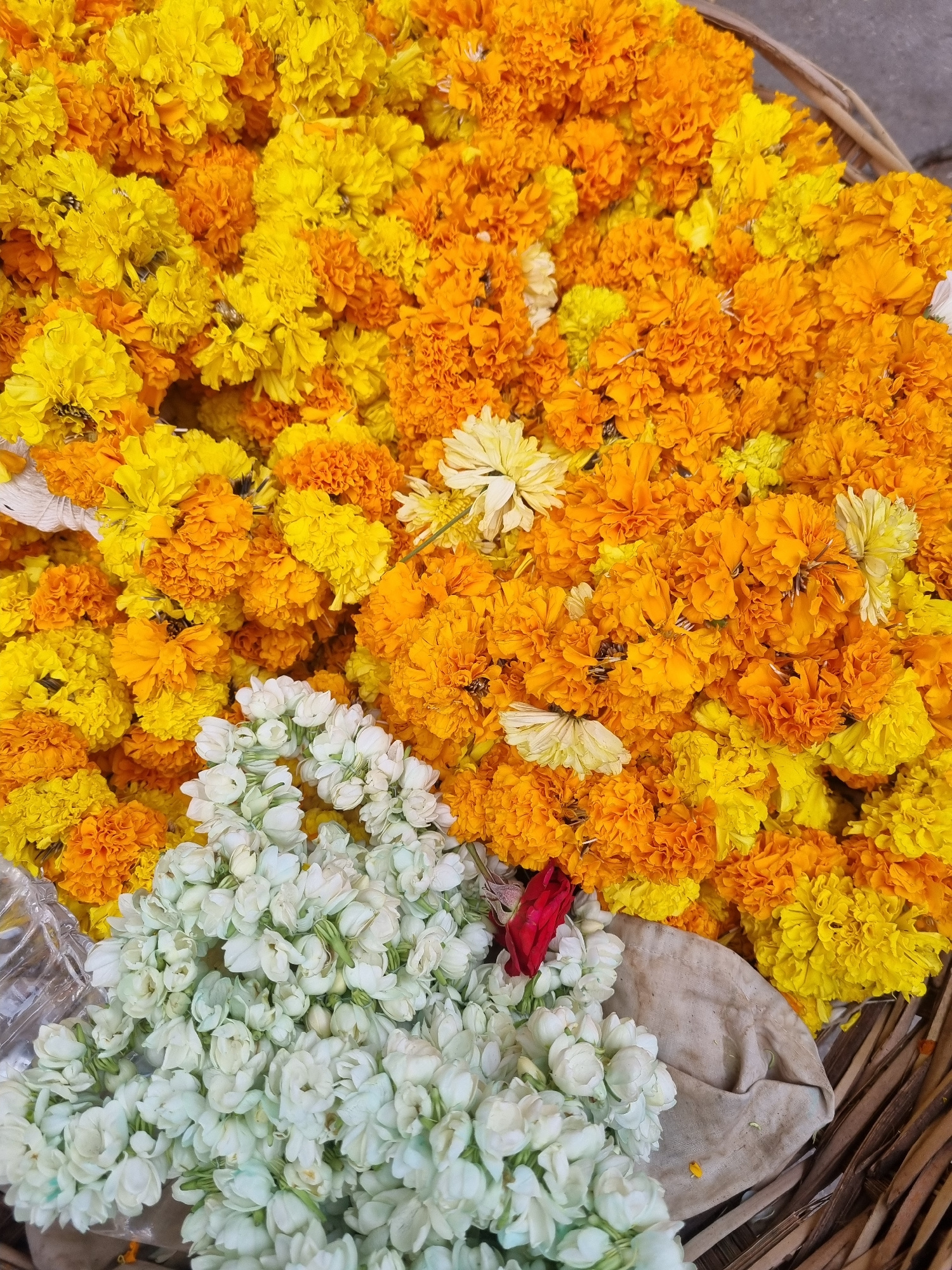 The image captures a vibrant scene of floral offerings, likely photographed in Puttaparthi, India, a location known for its spiritual significance. The main subjects are piles of flowers, predominantl…read more