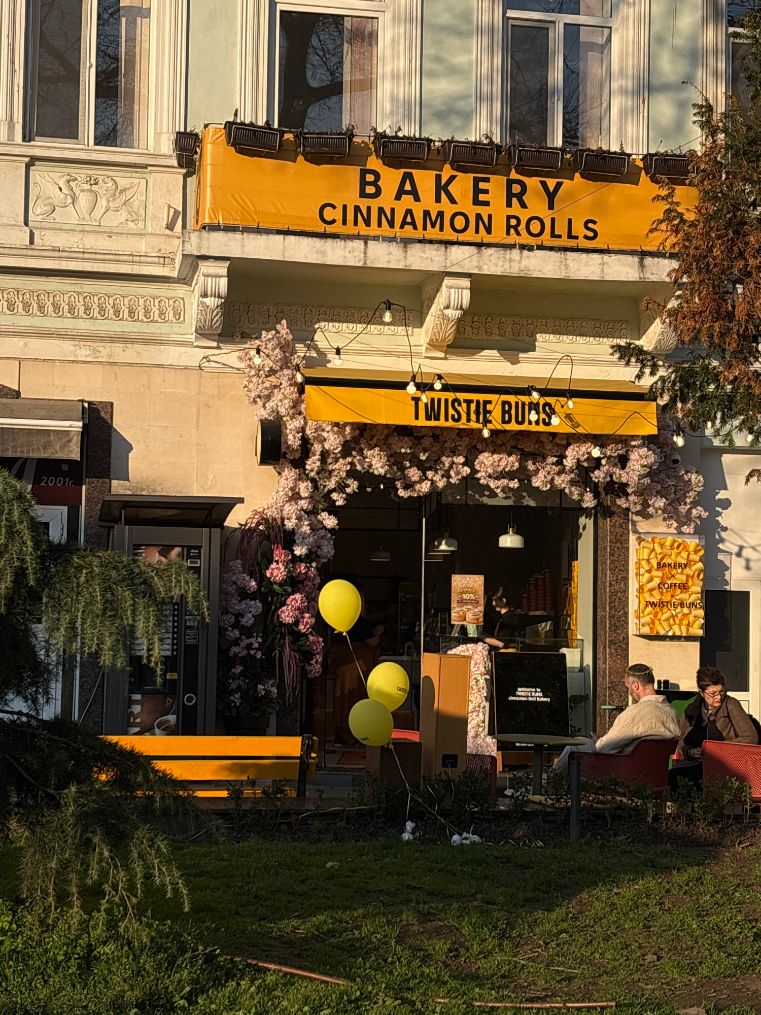 The image shows the exterior of "Twistie Buns," a bakery in Varna, Bulgaria. The building has a yellow banner with "Bakery Cinnamon Rolls" written on it, and another sign saying "Twistie Buns." Pink f…read more