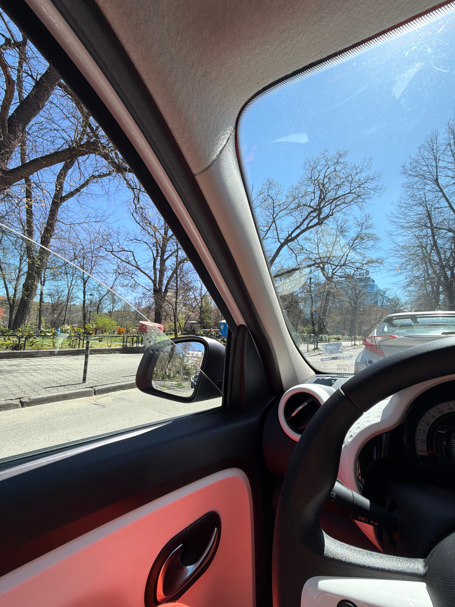 The image is taken from inside a car, likely in Sofia, Bulgaria, looking out towards a street with trees and a blue sky. The street appears to be lined with parked cars and possibly some buildings in…read more