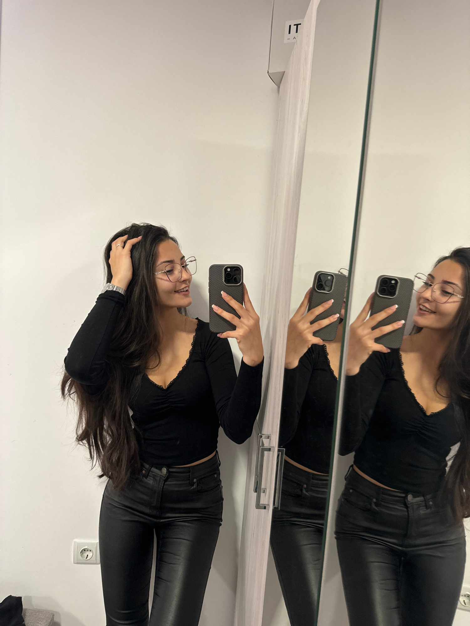 A young woman with long dark hair, wearing glasses, a black top, and black leather pants, is taking a selfie in front of a mirror. Her reflection is visible in the mirror. The scene appears to be indo…read more