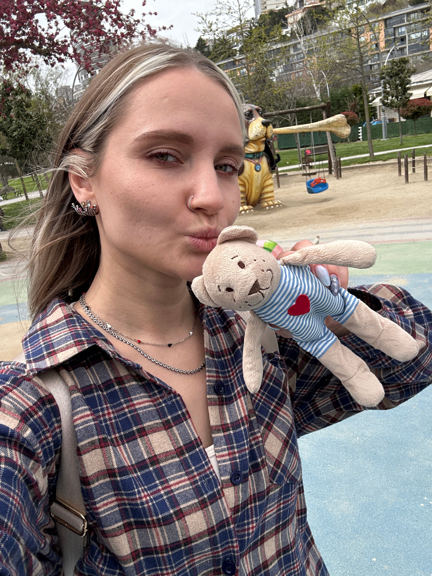 A woman is holding a stuffed bear in front of her face. She has blonde hair with dark roots, a nose ring, and is wearing earrings and a necklace. She is wearing a plaid shirt. In the background is a p…read more