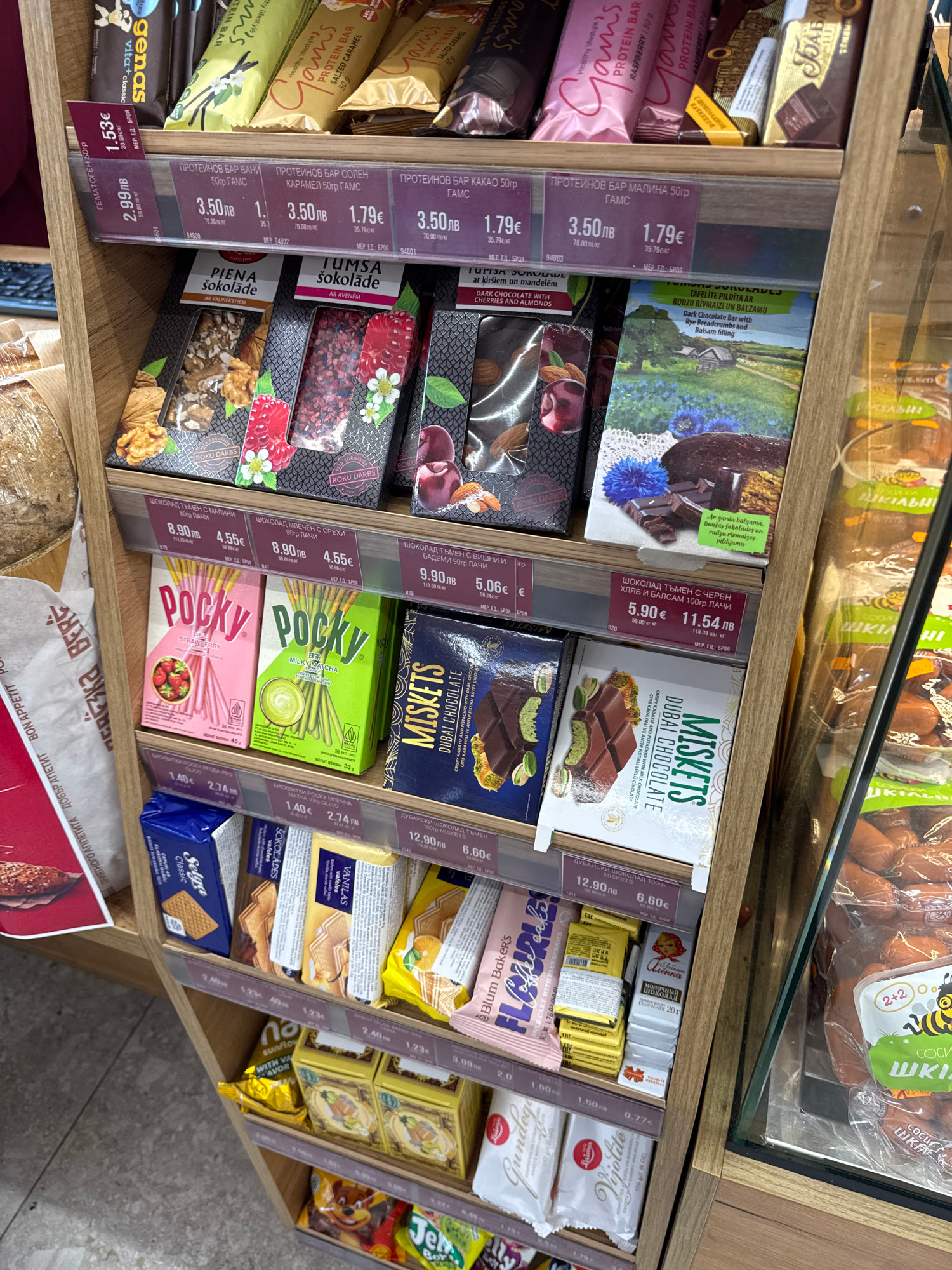 The image depicts a shelf filled with various chocolate and candy products inside a store. The products are arranged in rows and columns, with price tags displayed in front of each item. The featured…read more