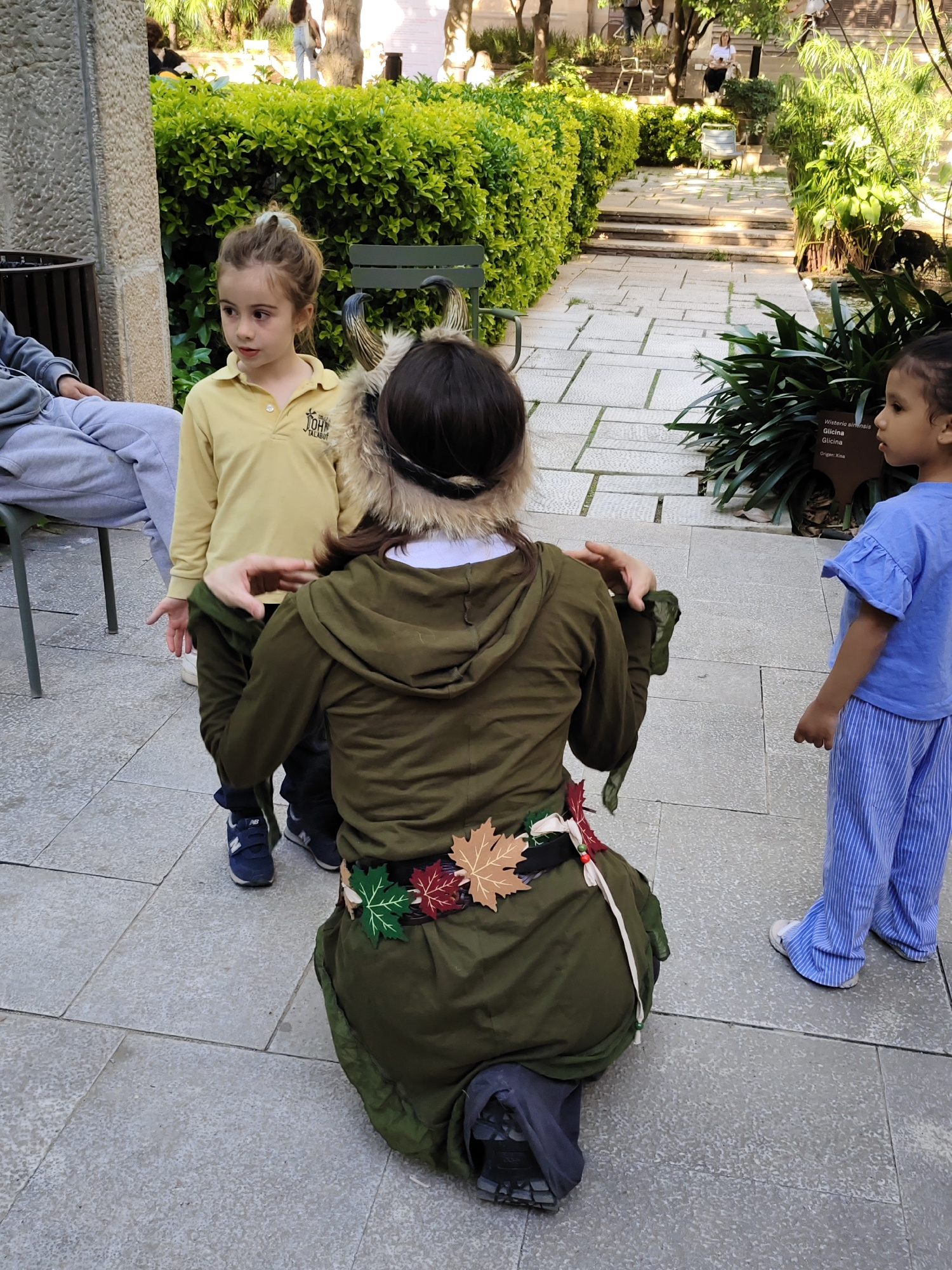 In an outdoor setting, two children are standing on a paved area, one in a yellow shirt and the other in a blue shirt with striped pants. An adult figure, with their back to the viewer, is kneeling an…read more
