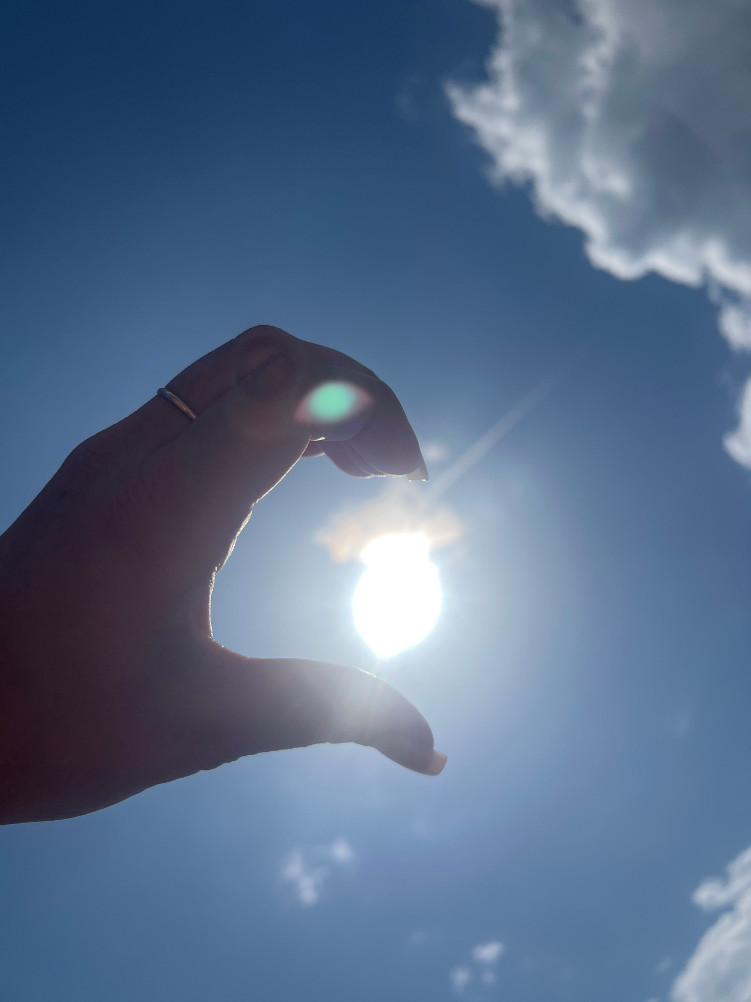 A low-angle shot captures a human hand silhouetted against a brilliant blue sky with scattered clouds. The hand is positioned centrally, curving its thumb and forefinger as if to grasp or frame the in…read more
