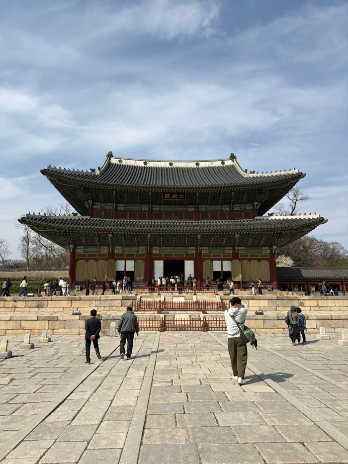 The image displays the Injeongjeon Hall, the primary throne hall of Changdeokgung Palace, situated in Jongno-gu, Seoul, South Korea. The two-tiered palace structure features dark grey tiled roofs with…read more