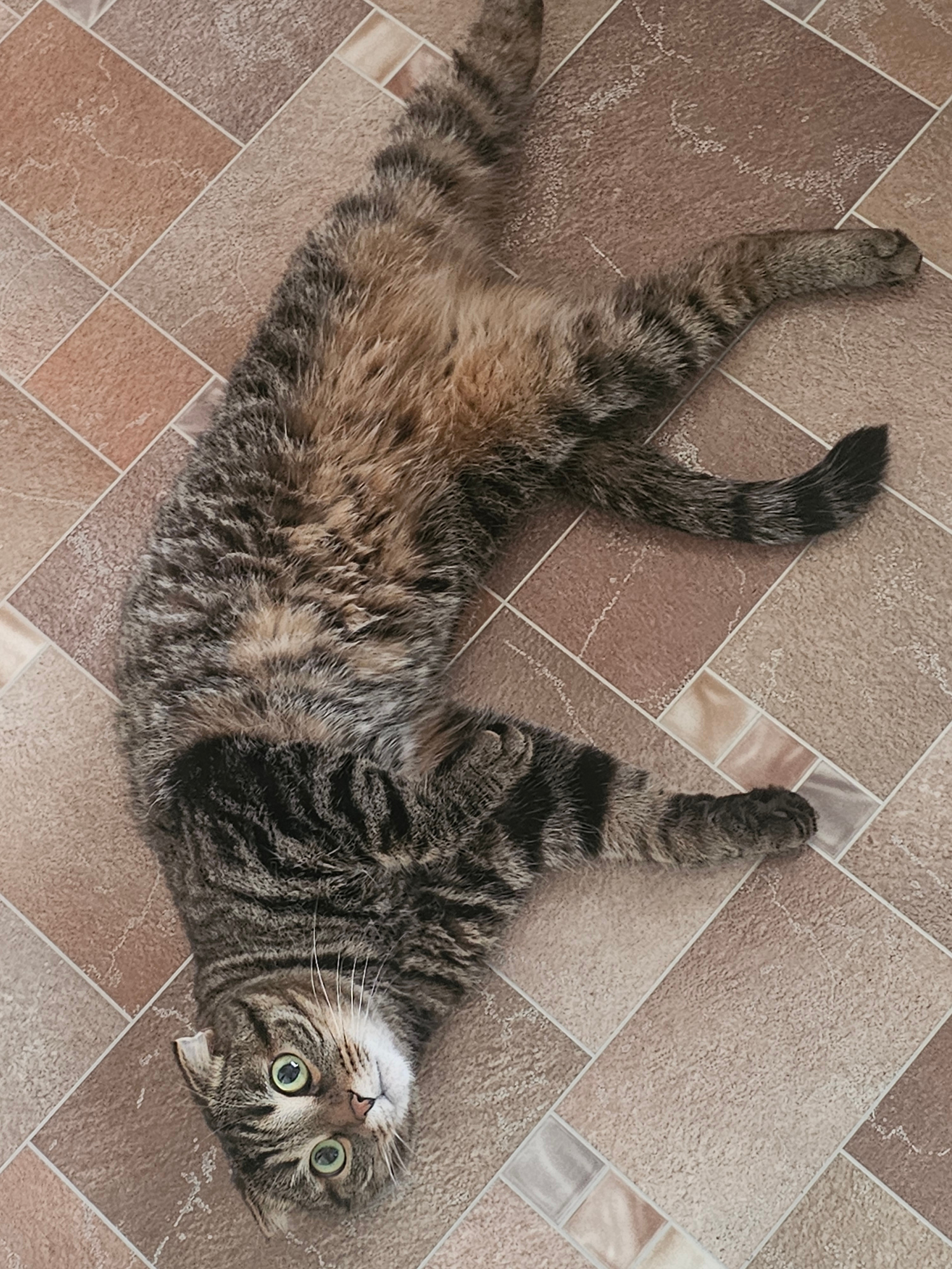 A tabby cat is lying on its back on a tiled floor. The cat has green eyes and is looking up at the camera. The cat's front and back legs are extended. The location is not provided.