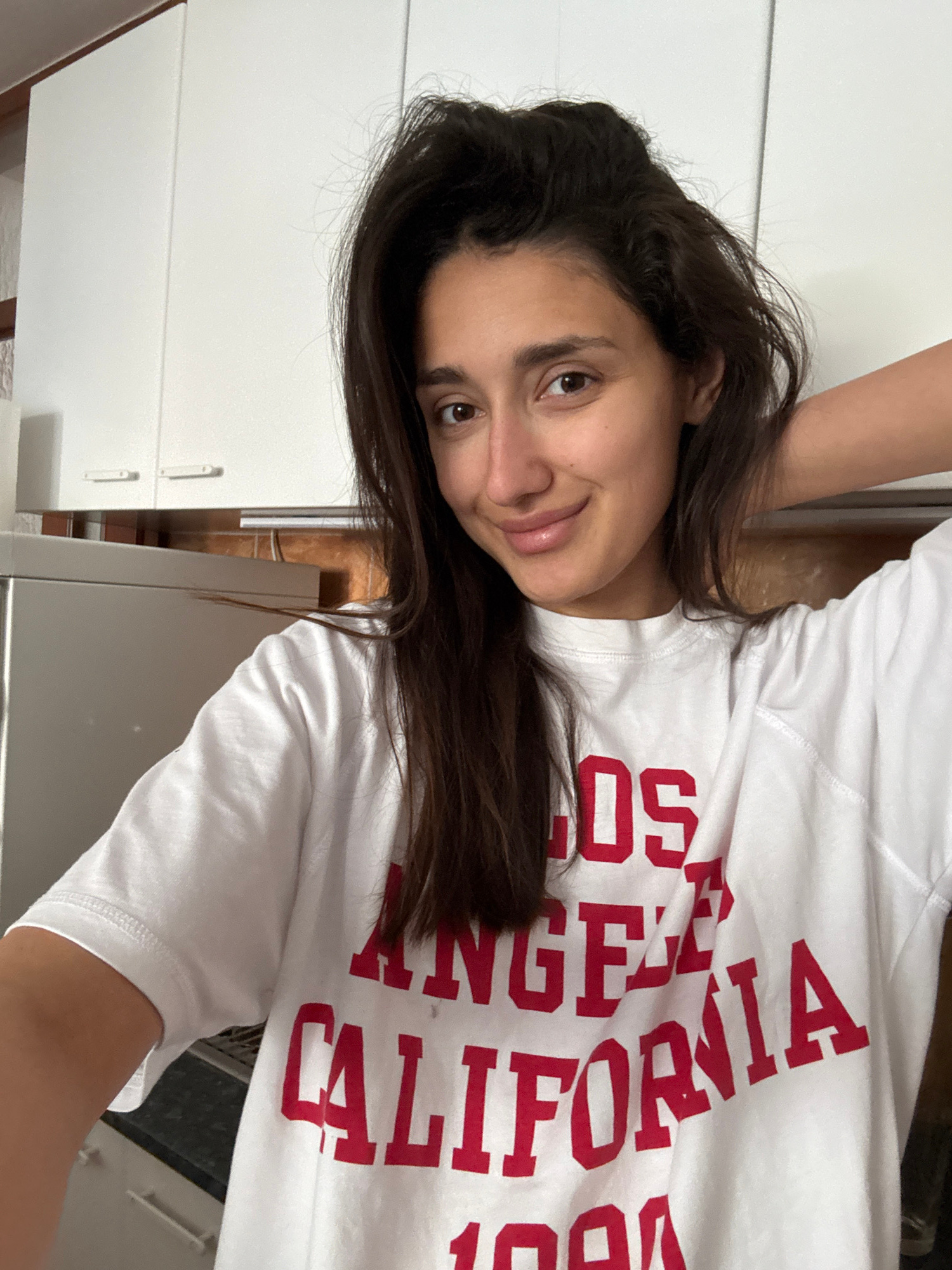 A woman with long, dark hair is wearing a white t-shirt with "LOS ANGELES CALIFORNIA" printed in red. The photograph is taken indoors, likely in a kitchen, with white cabinets visible in the backgroun…read more