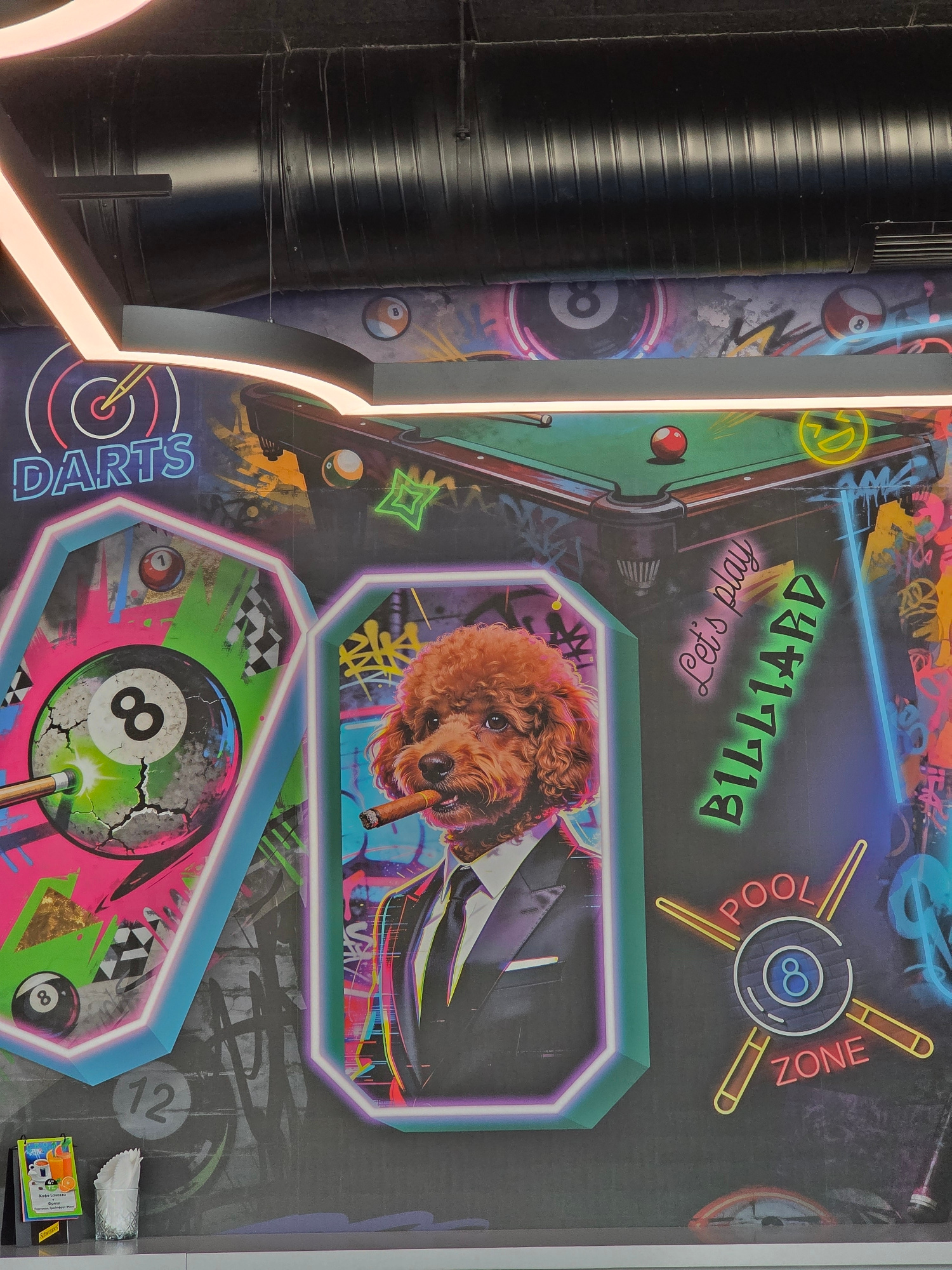 The image depicts an indoor wall mural with neon-style designs, likely in a commercial or entertainment space. The designs feature a pool table, a dog in a suit smoking a cigar, darts, and an eight-ba…read more