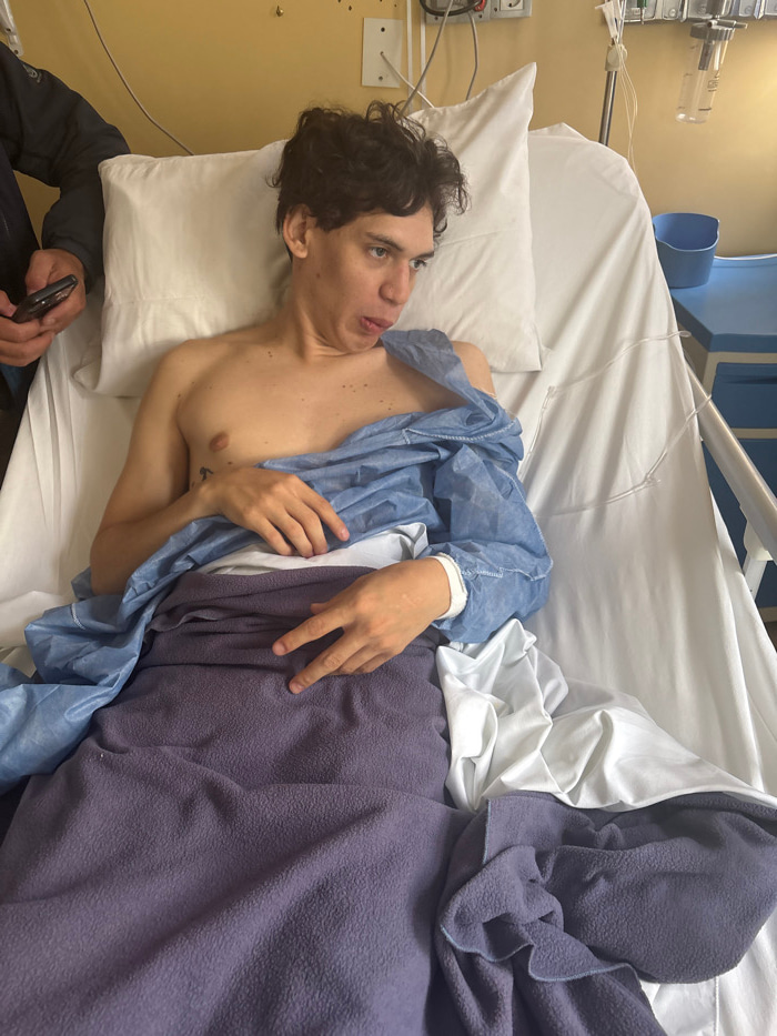 A thin, curly-haired person lies in a hospital bed, partly covered by a purple blanket and a blue medical gown. They have pale skin and appear to be looking upwards. An IV pole and medical equipment a…read more