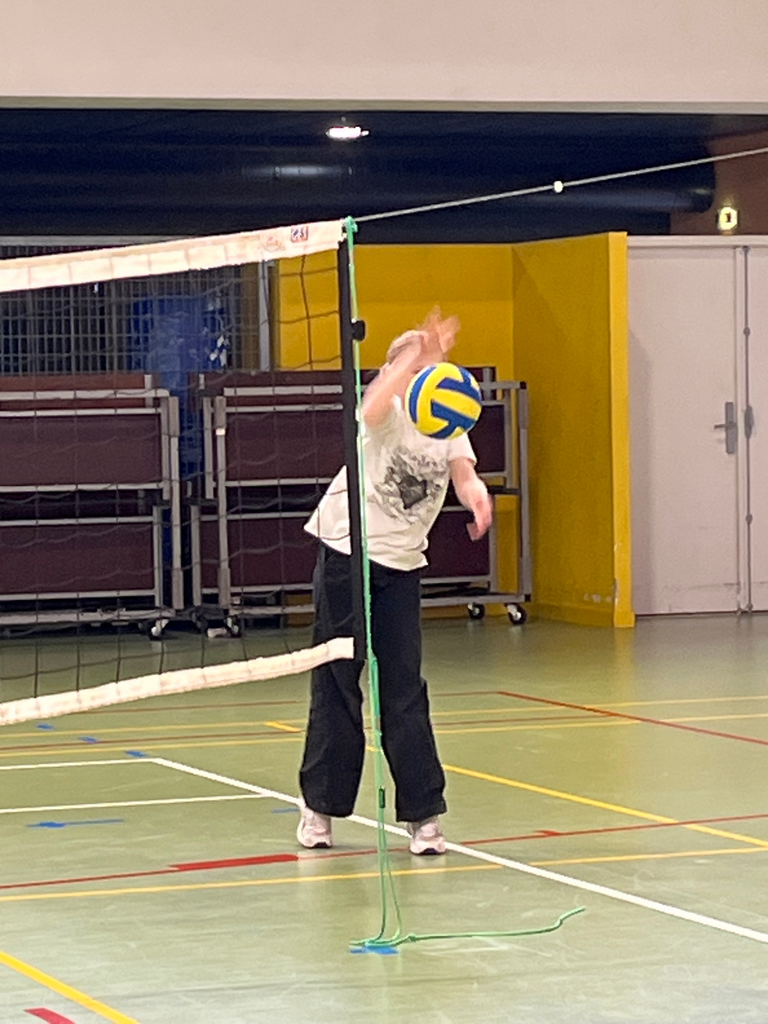 A person is playing volleyball in an indoor gymnasium. The person, wearing a white t-shirt and black pants, is positioned near a volleyball net, with a yellow and blue volleyball appearing to be in mo…read more