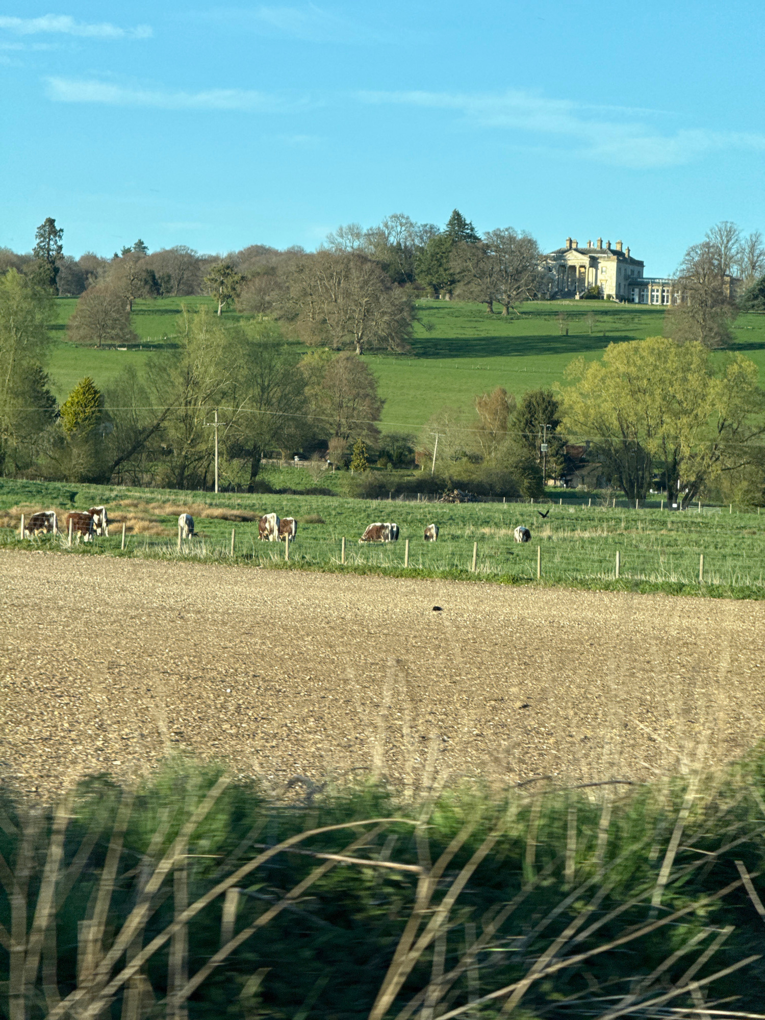 A landscape photograph taken in the Dacorum, United Kingdom, shows a verdant field with grazing cattle adjacent to a gravel road. In the distance, a large estate building is visible. A wooded area bor…read more