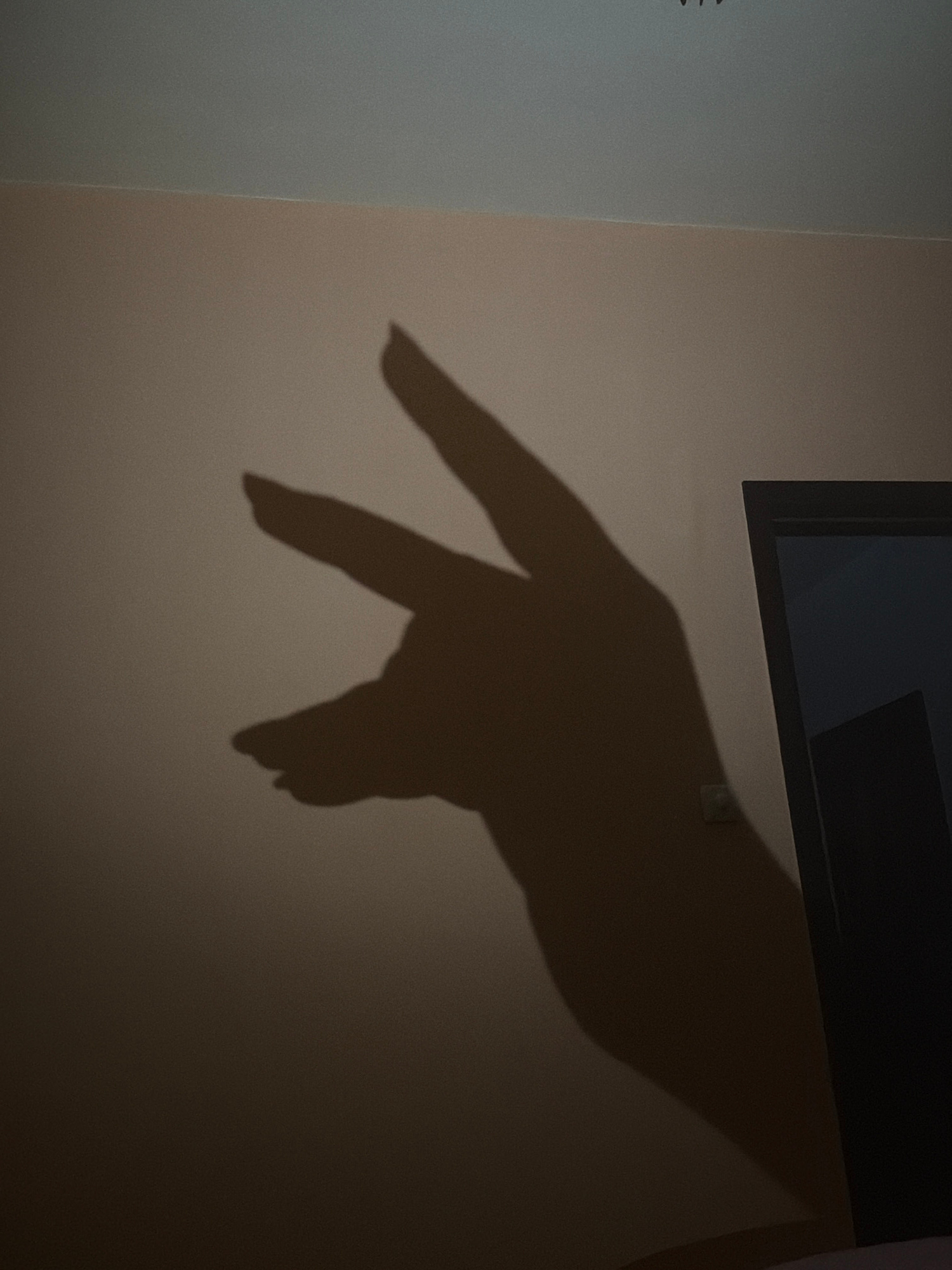 The image displays a prominent, dark shadow of a human hand cast onto a light-colored wall. The hand forms a gesture with its index and middle fingers extended upwards, while the thumb, ring finger, a…read more