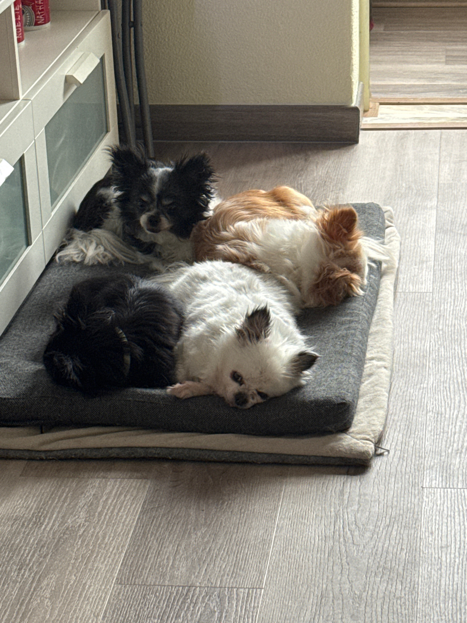 Four small dogs are piled on a gray cushion. From top to bottom, the dogs are colored tan and white, white and black, black and white, and entirely black. The cushion sits on a white surface with grid…read more