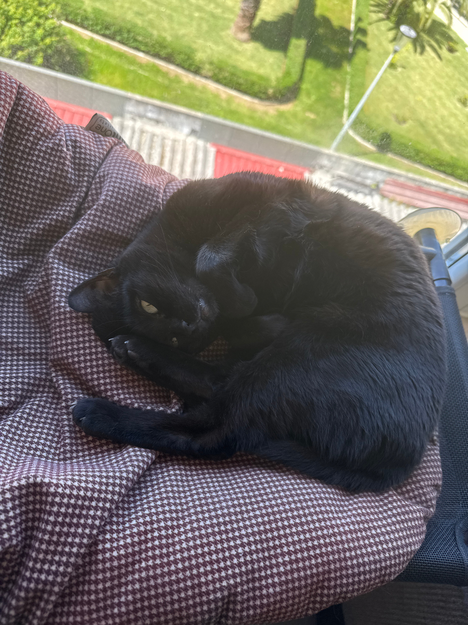 A black cat is the central subject, curled up on a patterned cushion or blanket by a window. The cat is lying on its back with its body forming a tight curl, and one bright yellow-green eye is partial…read more
