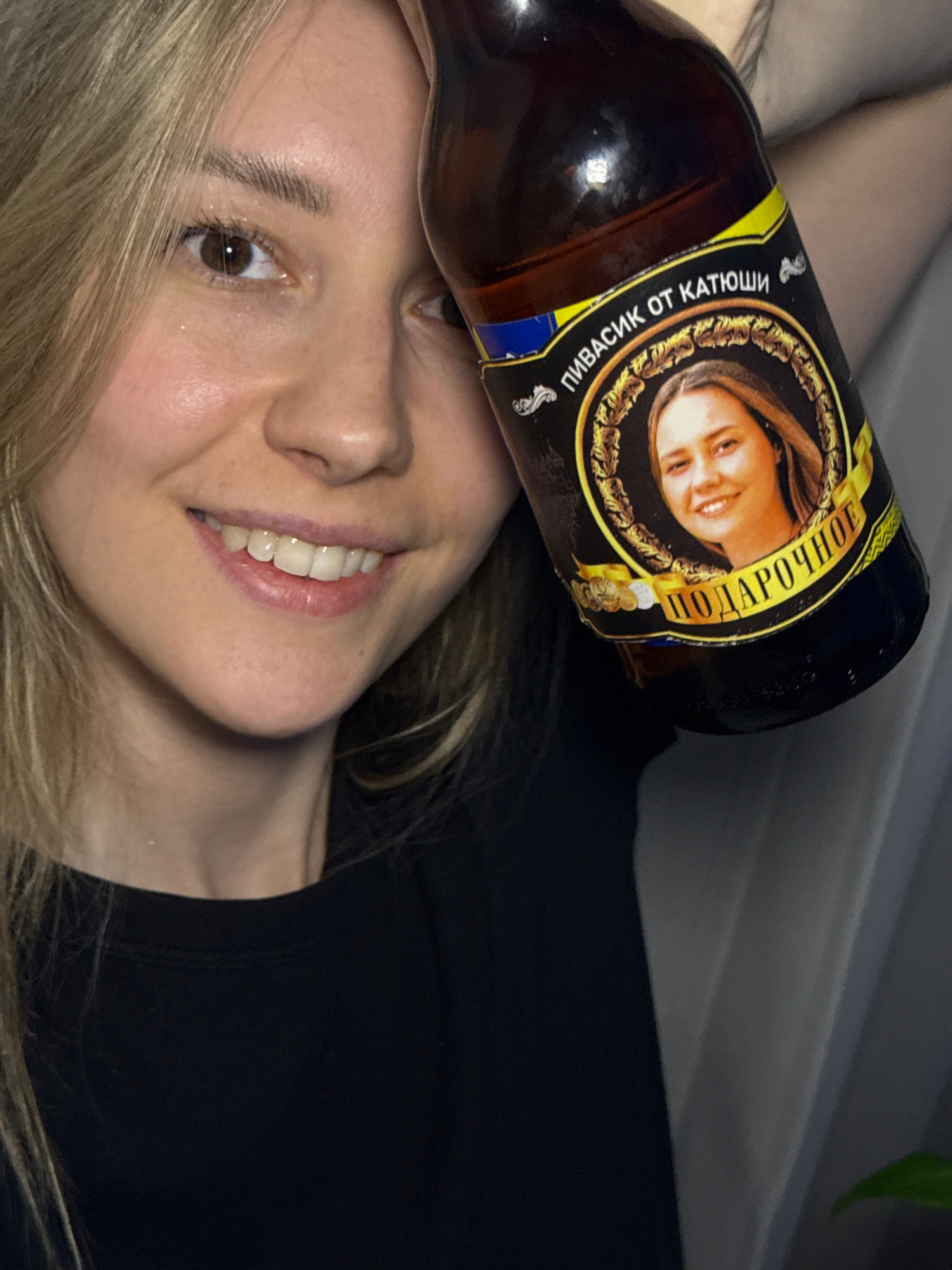 A fair-skinned woman with long blonde hair, smiling, poses closely with a bottle of dark brown liquid, likely beer, displaying the label. The bottle's label includes the words "ПИВАСИК ОТ КАТЮШИ" and…read more