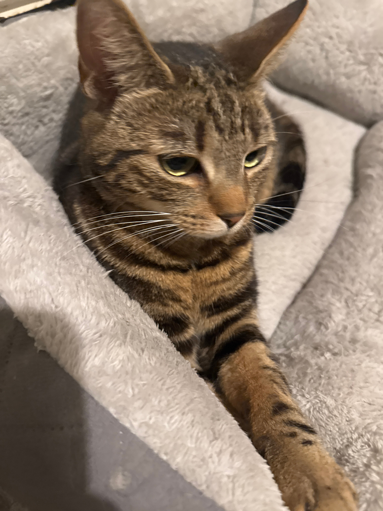 A tabby cat is lying in a grey fluffy cat bed. The cat is light brown with dark brown stripes. It's lying on its left side, with its left arm extended towards the right of the frame. The cat's head is…read more