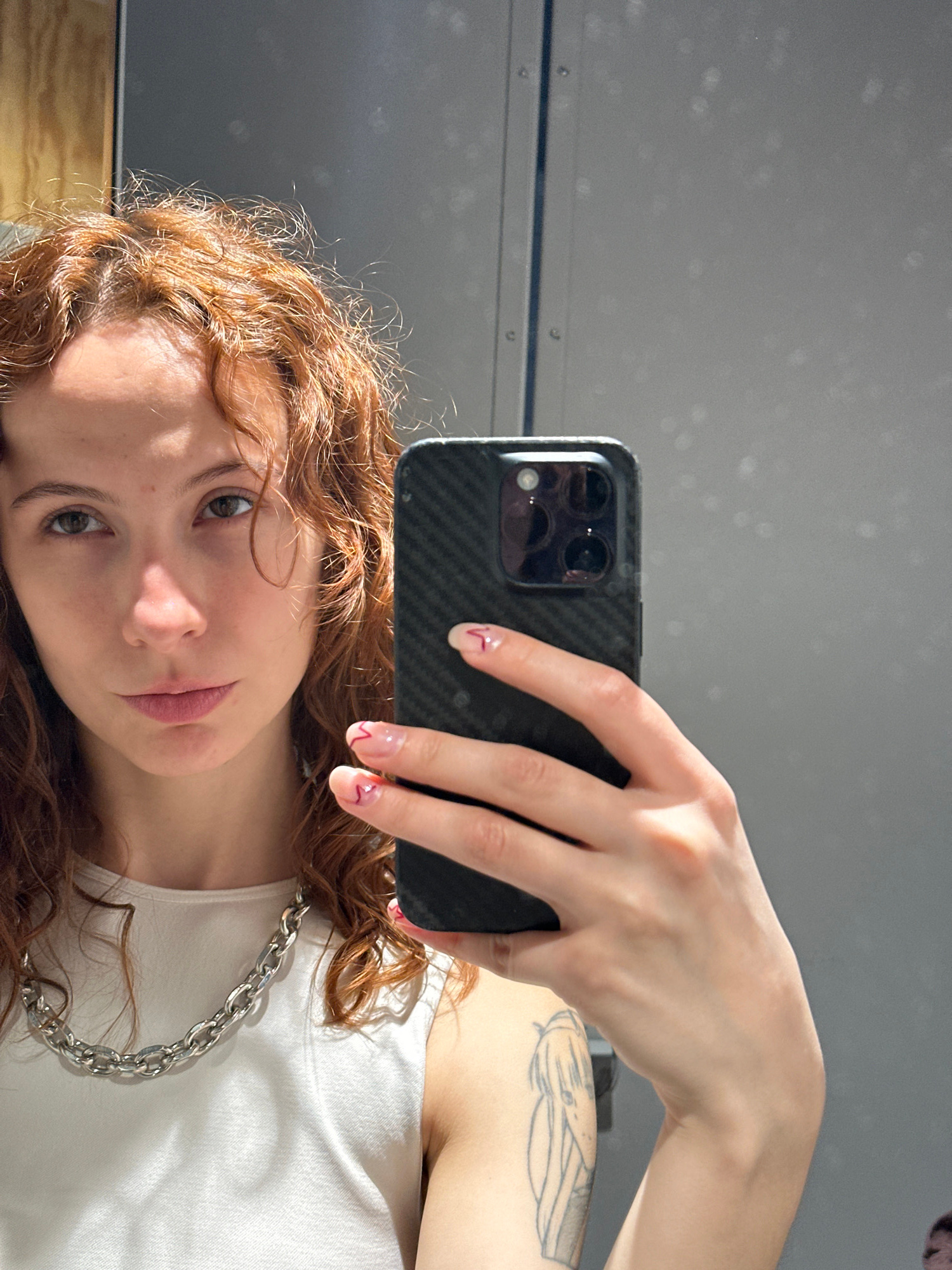 A selfie taken in a mirror from an eye-level perspective features a young woman with wavy, auburn hair, light skin, and a silver chain necklace. She wears a white top and has a tattoo on her upper arm…read more