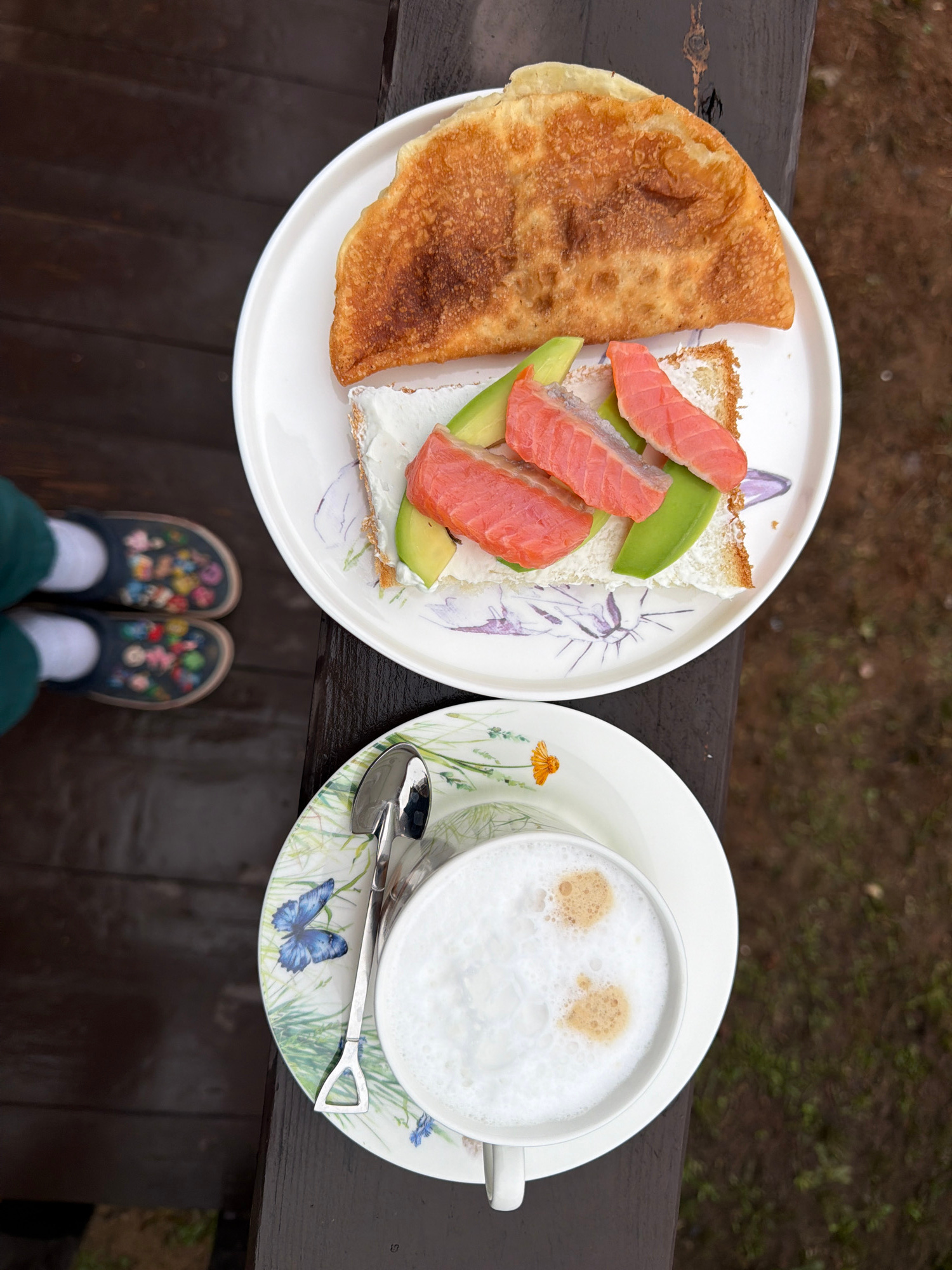 The image presents a top-down view of a meal and beverage arrangement, accompanied by a partial view of a person's feet. The meal consists of a plate with a portion of flatbread and an open-faced sandβ¦read more