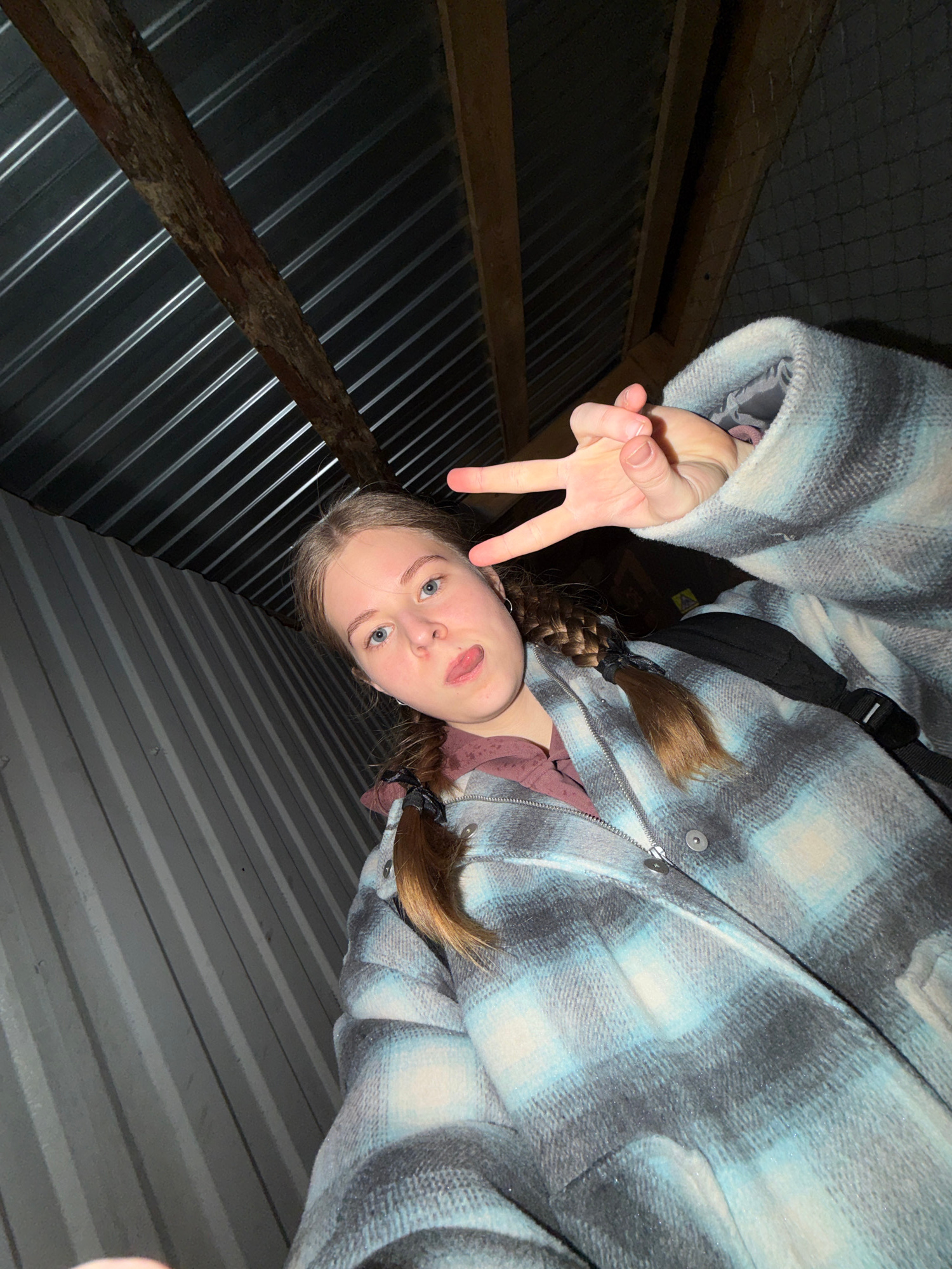 The image is taken at an angle from below, showing a young woman in a gray and blue plaid jacket. She is making a peace sign with her left hand. Her hair is in braids, and she is looking down at the c…read more