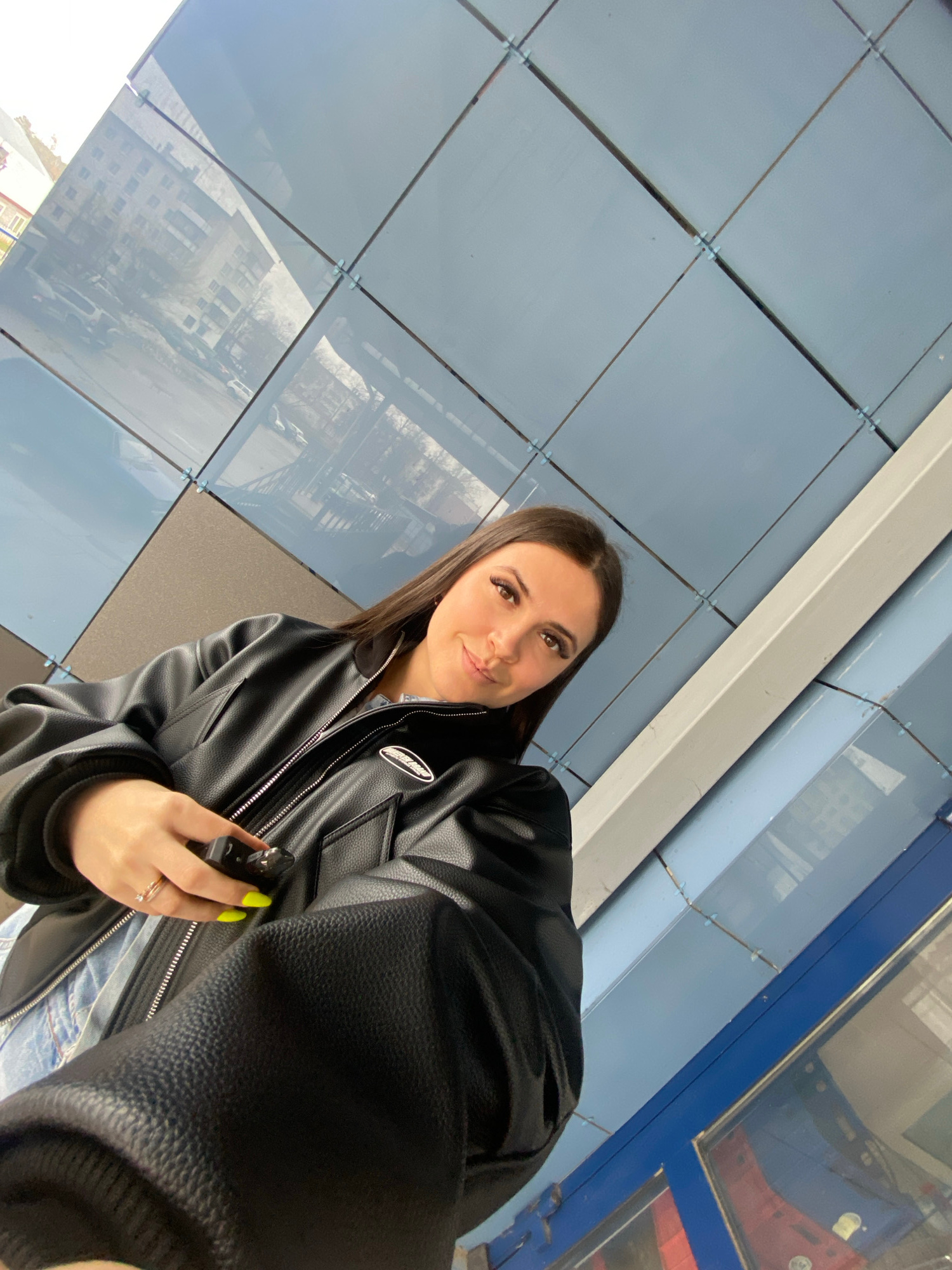 A woman is taking a selfie in Chaikovsky, Russia. She has long brown hair, fair skin, and wears a black leather jacket. The location appears to be an enclosed walkway or shelter with a glass ceiling cβ¦read more