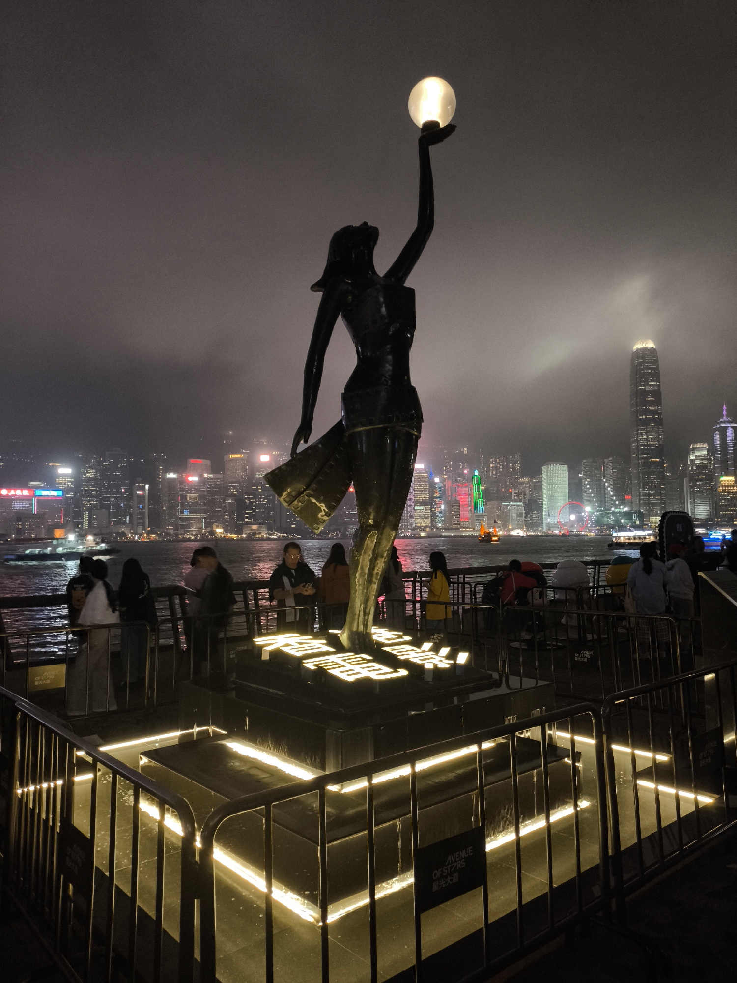 The image displays a nighttime scene at the Avenue of Stars on the Tsim Sha Tsui waterfront in Hong Kong, China, overlooking Victoria Harbour and the illuminated Hong Kong Island skyline. In the fore…read more