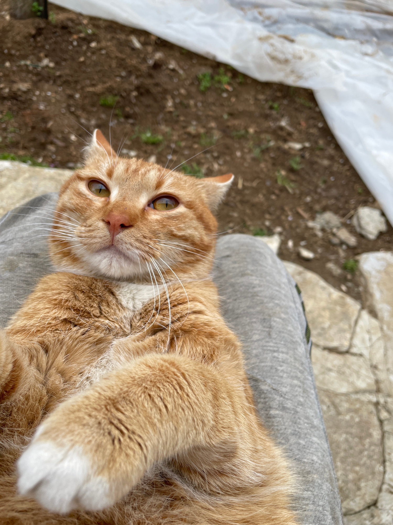 A close-up, slightly angled shot depicts an orange tabby cat resting on a person's lap. The cat is positioned on the right side of the frame, with its head turned towards the left, looking directly atβ¦read more